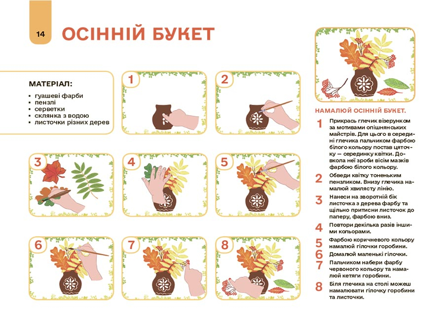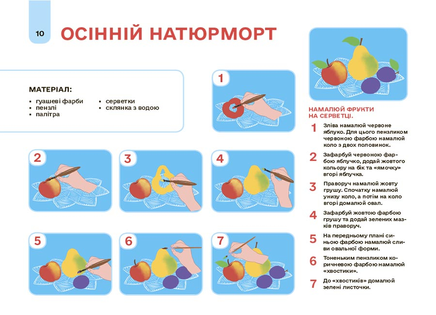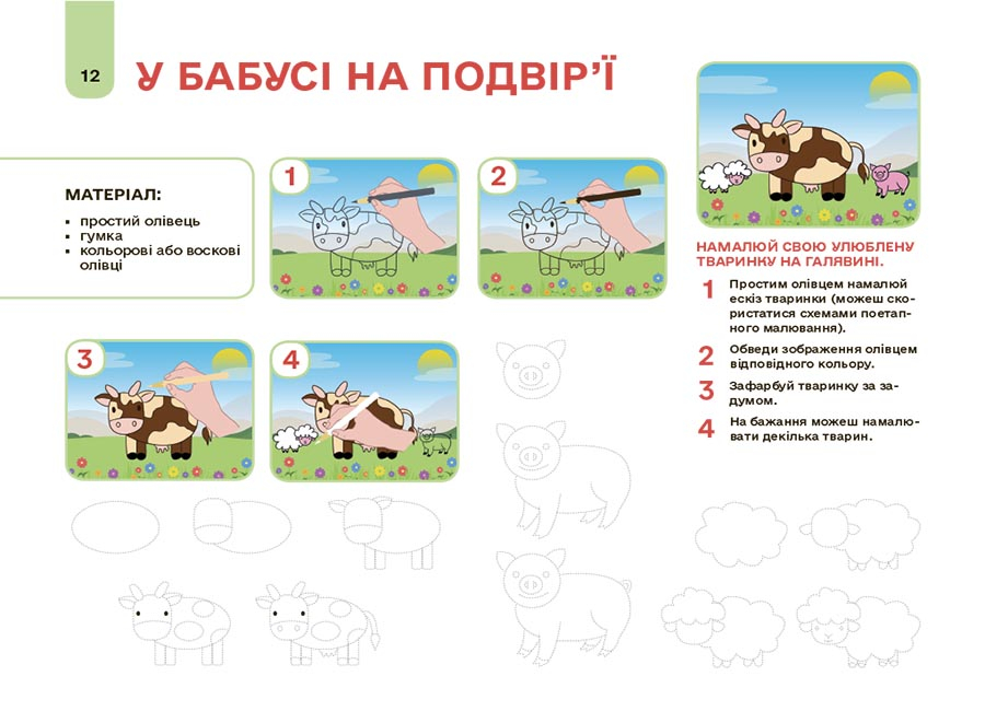 Альбом для малювання містить матеріали з покроковими інструкціями та аркуші-основи з відповідним фоном і певними елементами для домальовування або оздоблення. Відповідно до програми розвитку дітей 5-6 років дібрані теми для малювання різними засобами: гуашевими фарбами, олівцями, фломастерами. Передбачено малювання традиційними та нетрадиційними техніками (штампами, патичком, відбитками природного матеріалу та іншими). Рекомендовано для використання на заняттях у дитячих дошкільних закладах, а також для роботи батьків із дітьми.