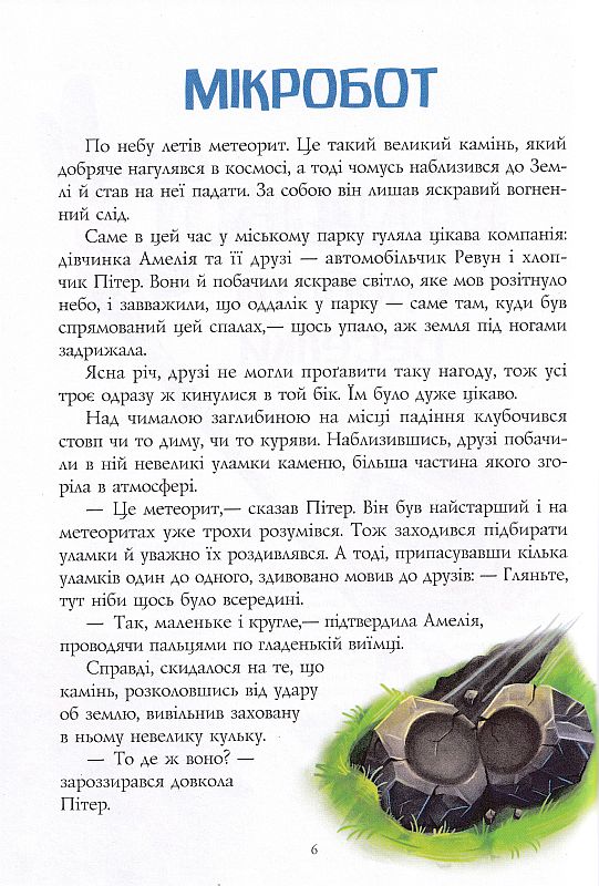 У цій захопливій книжці — дві неймовірні історії про Мікробота. Пустун і справжній супергерой, маленький робот обожнює бавитися й гратися в хованки. Опинившись на Землі, прибулець зустрів Амелію й Пітера, і тепер вони разом мандрують і потрапляють у дивовижні пригоди. Разом друзі розважатимуться й шукатимуть вхід у казку, протистоятимуть космічному лиходію, подорожуватимуть пустелею, а ще зітнуться з Кам’яним драконом, який не дає спокою людям. Ці маленькі сміливі герої рятуватимуть великий світ, і читачі разом із ними теж неодмінно захочуть допомагати іншим і покращувати все довкола.