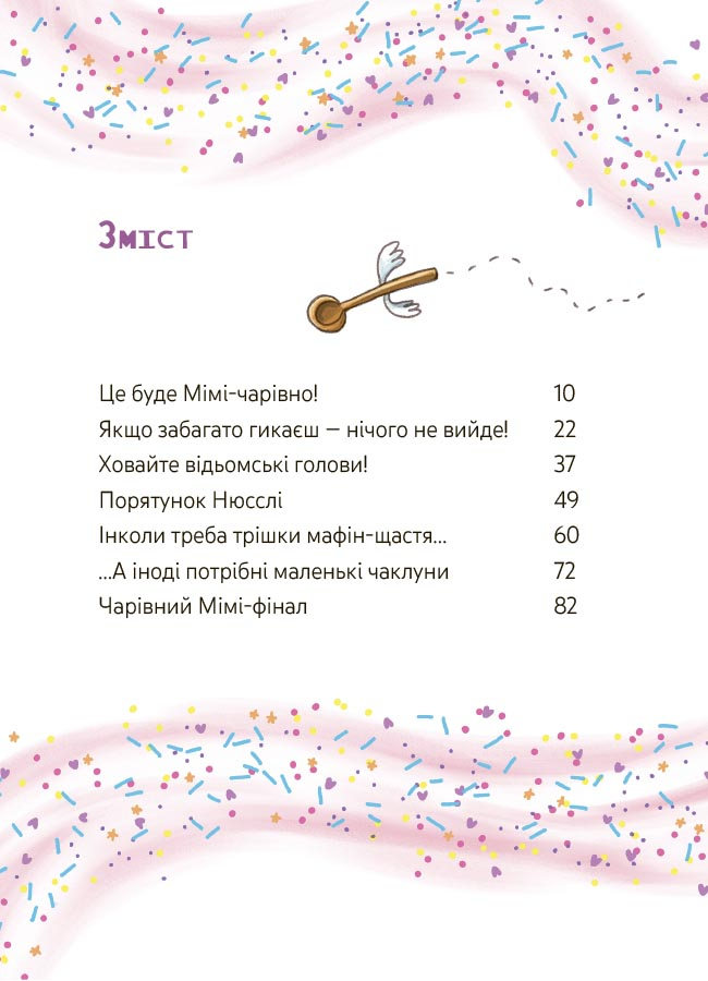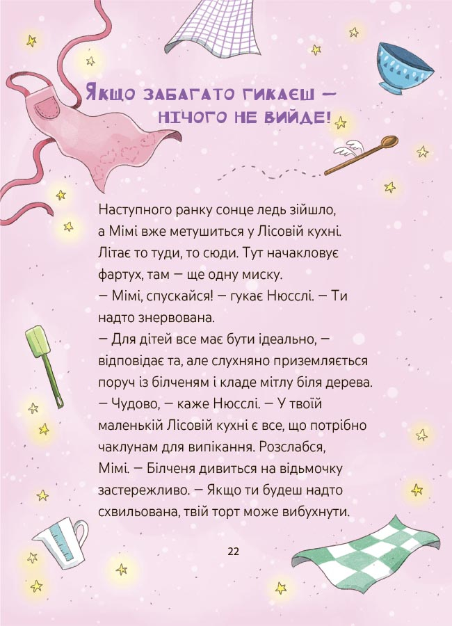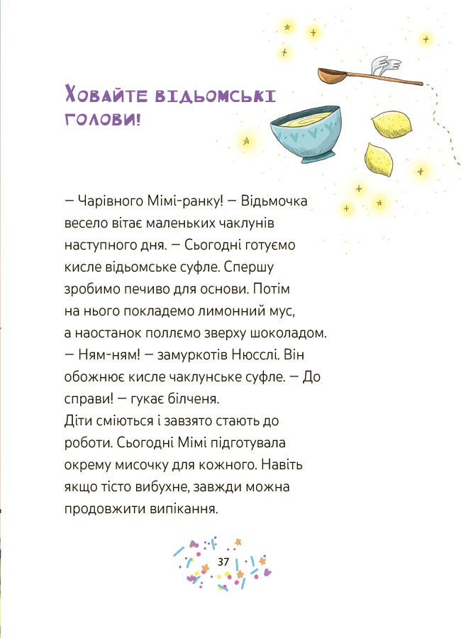 Запрошуємо маленьких читачів до світу магії та чарівництва — у смачний і дивовижний світ, де мафіни вміють літати, а поцілунки мають присмак лимону! Школа для відьом шукає нову пекарку, і Мімі Цукроперлинка — незвичайна кулінарка, яка виграла кухарський конкурс у Гренландії, — вирішує спробувати свої сили. Та на неї чекає не лише пробний урок, а й суперництво з відьмою Фурункель. Весела, тепла й динамічна історія про віру в себе, доброту і магію маленьких мрій — ідеальна для спільного читання з дітьми від 7 років.