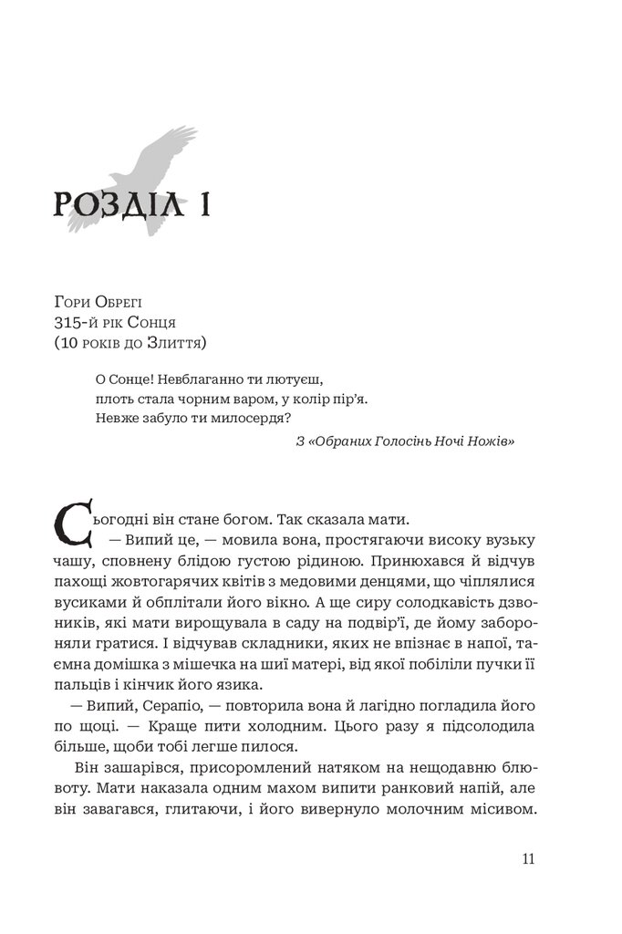 Влада жерців — безмежна та священна. Однак культисти ревно моляться за відродження жорстокого давнього бога, що повернеться та поглине сонце. Ш’яла вміло заворожує Співом морські хвилі і впокорює людську волю. Та чи впорається вона із завданням привезти у Святе Місто засліпленого, пошрамованого Серапіо, одержимого однією-єдиною метою? Дике, первісне чаклунство, велетенські чудовиська, політичні інтриги, понівечені божества й незагоєна жага помсти. Схоже, насувається буря. І прекрасний континент Меридіан може її не пережити.