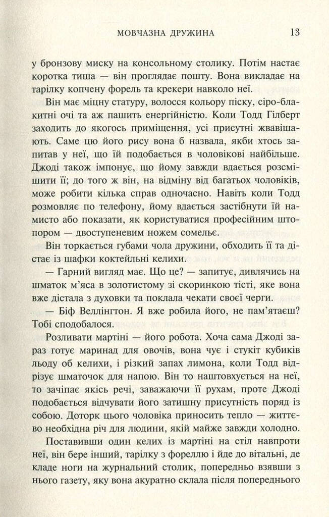 Важко передбачити, як поводитимуться навіть цілком успішні й адекватні люди, у яких руйнується життя, кого вони звинуватять у своїх бідах і які методи захисту оберуть. Подружнє життя героїв цього роману, в яких усе пішло шкереберть, змальоване так майстерно, з такого ракурсу, події у ньому розгортаються так неочікувано, що читач ще довго роздумуватимете над прочитаним після того, як перегорнете останню сторінку.