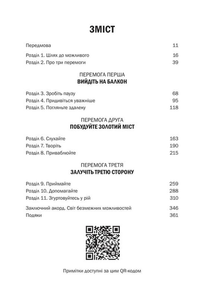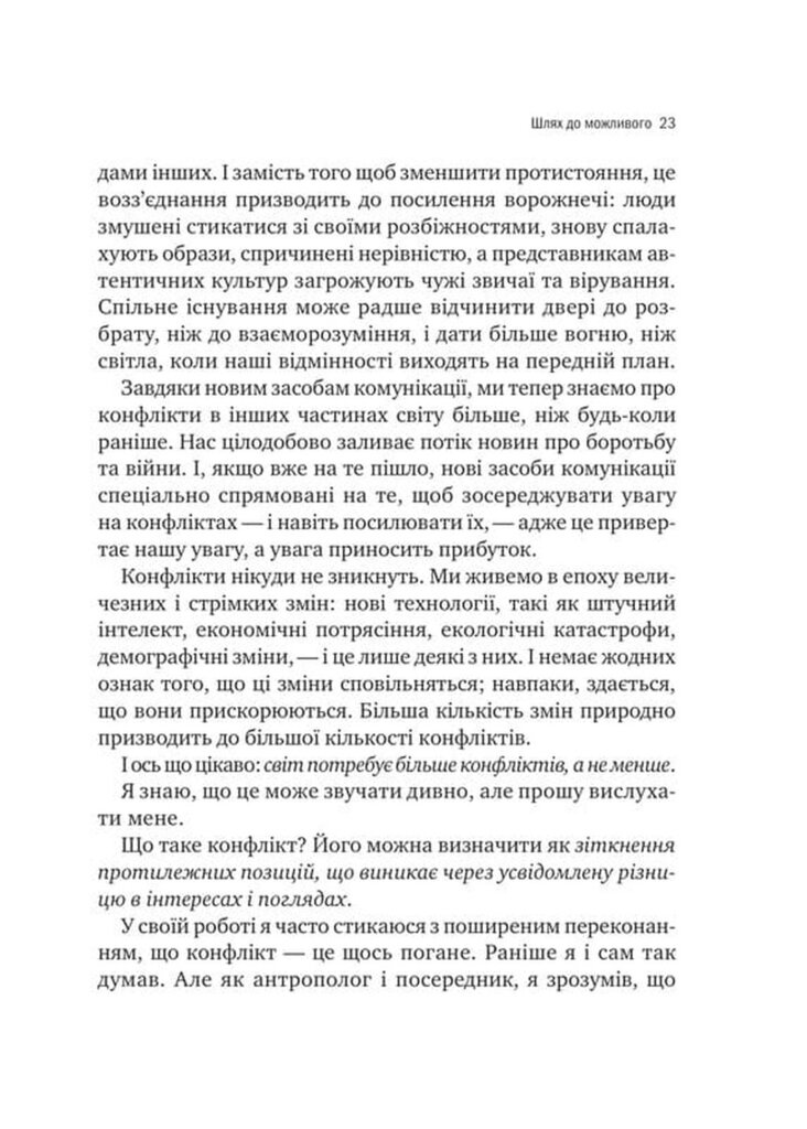 Автор ділиться численними історіями з власної практики, що спонукають поглянути на конфлікти — від сімейних до міждержавних — по-новому, і додає: протистоянь не уникнути, але ми можемо перетворити їх на джерело нашого зростання.