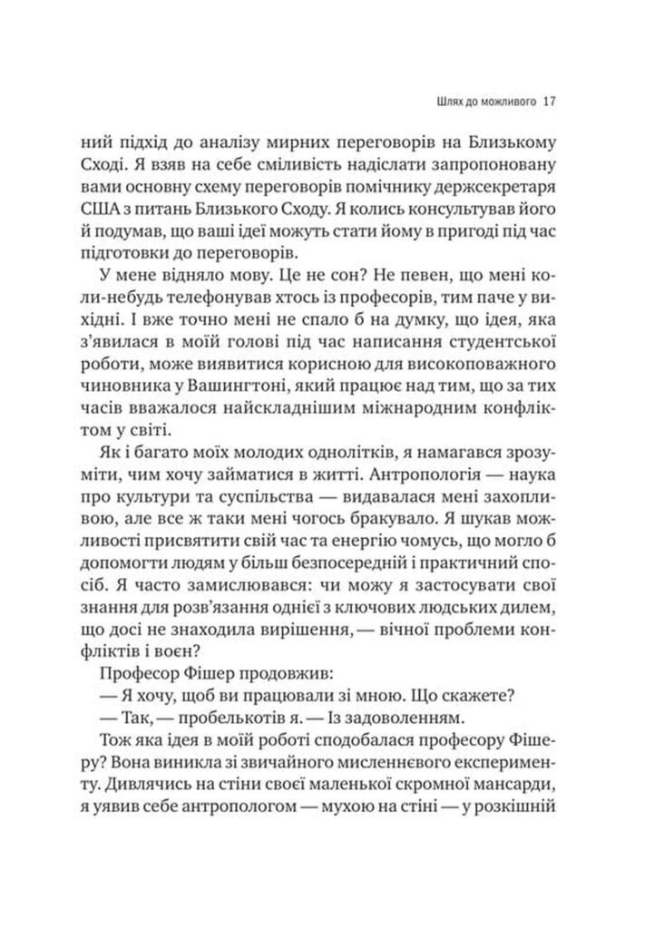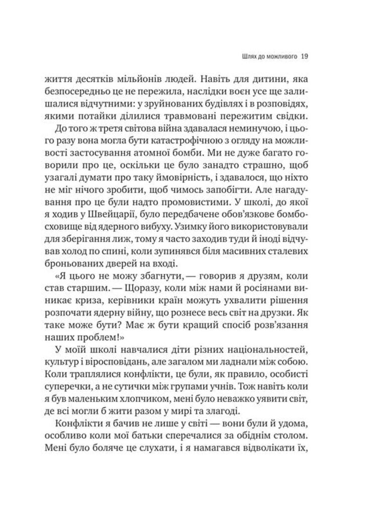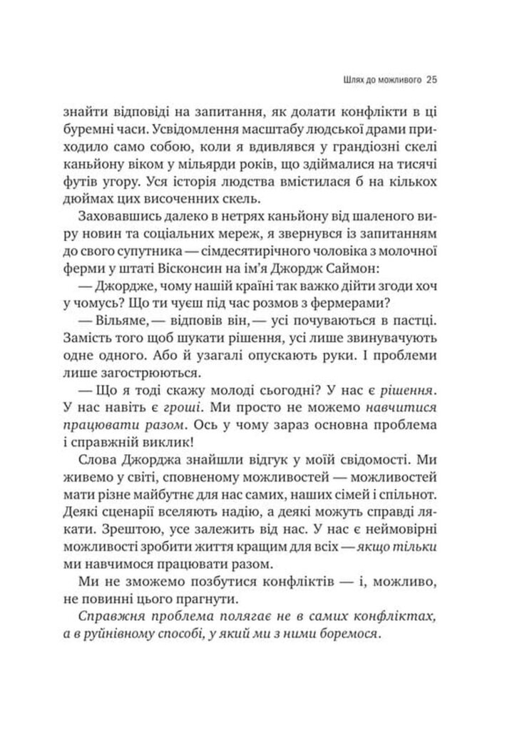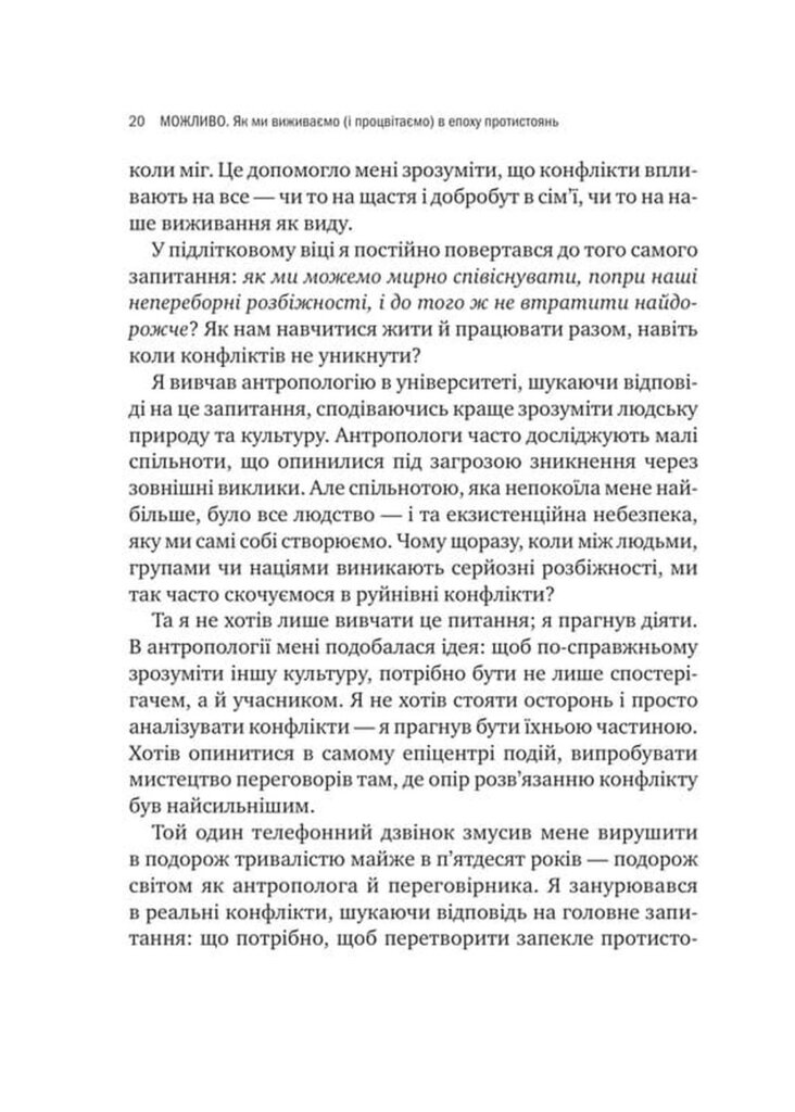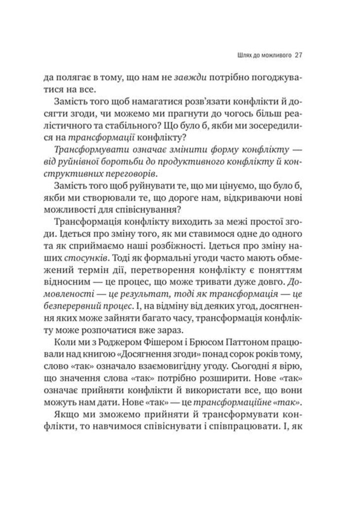 Сучасне життя сповнене конфліктів: вони роз'єднують родини, суспільства й цілі країни. Проте Вільям Юрі переконує: проблема не в самих протистояннях, а в тому, що люди не вміють давати їм раду. Автор стверджує: не варто ставити собі за мету розв'язати кожен конфлікт — краще працювати над його трансформуванням. Як це зробити? Юрі запрошує читача стати можливістом — людиною, яка знаходить креативні шляхи перетворення токсичних протиборств на спільне благо.