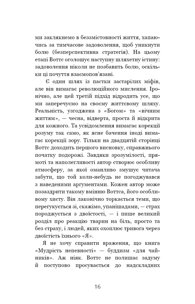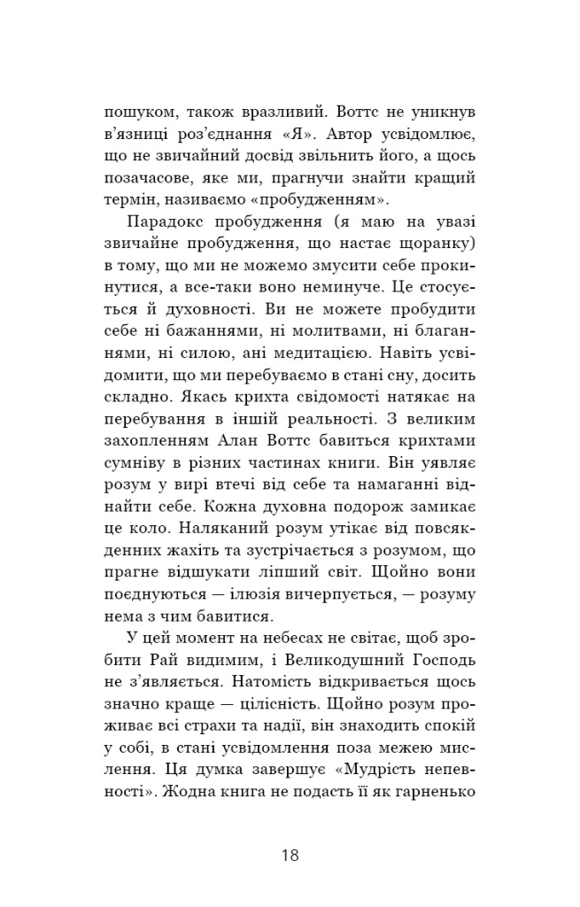 Ми витрачаємо надто багато часу, намагаючись передбачити й спланувати майбутнє й нарікаючи на минуле. Ми часто втрачаємо задоволення від проживання моменту, намагаючись переконатися, що наступний момент буде таким же приємним. Спираючись на східну філософію та релігію, Алан Воттс стверджує, що лише визнаючи те, чого ми не знаємо і не можемо знати, люди здатні знайти щось справді варте знання. Щоб жити повноцінним життям, потрібно прийняти сьогодення — повністю жити саме зараз. Елегантно обґрунтована й зрозуміло написана, ця невелика книга містить у собі тисячолітню мудрість, яка вчить бути щасливим у непевності. Рецензія Алан Воттс, британський філософ і психолог, стверджує, що причиною людського розчарування та тривоги є нездатність людей повноцінно жити в сьогоденні та їхні марні пошуки психологічної безпеки. Спираючись на східну філософію та релігію, з наголосом на буддизмі, він досліджує, чому люди такі незадоволені й нещасливі.
