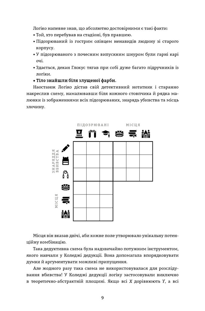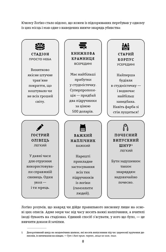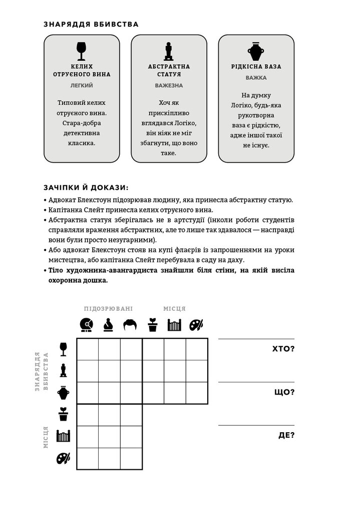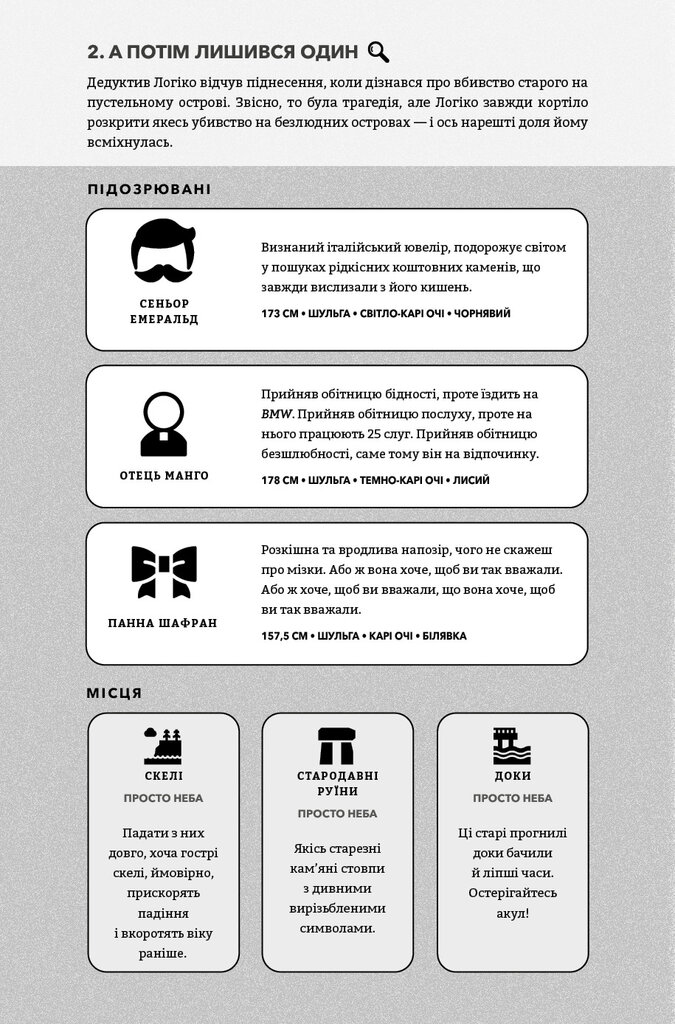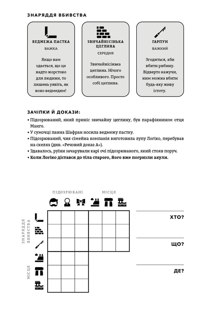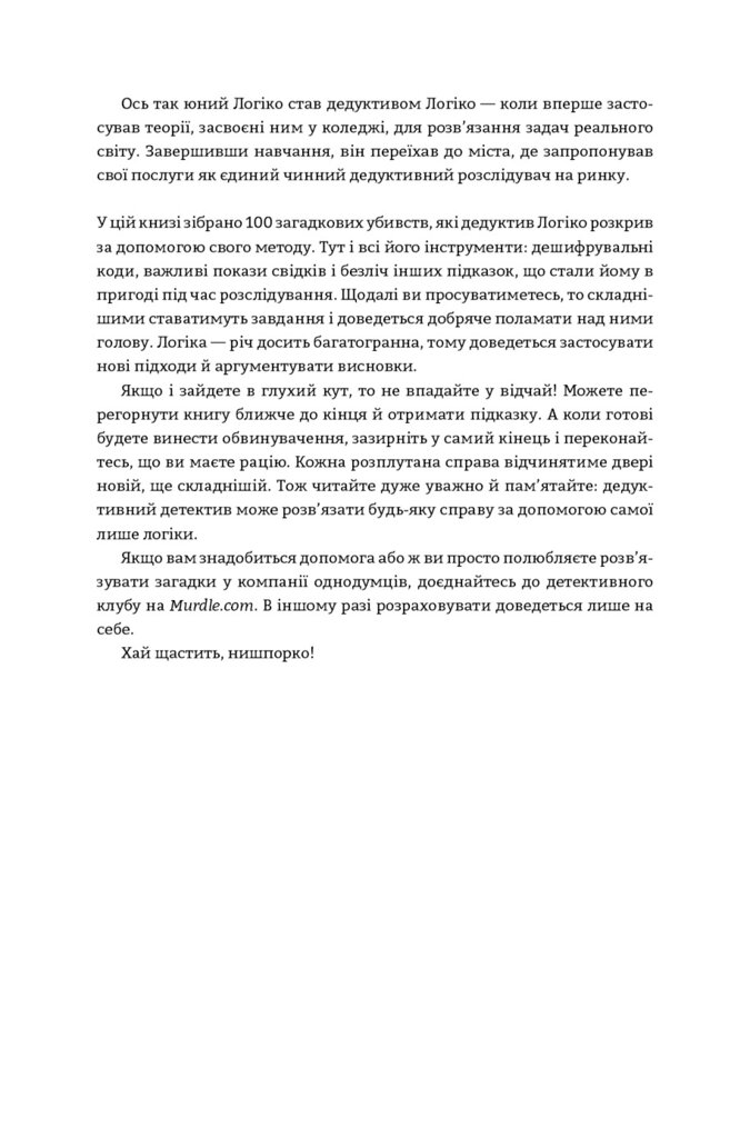 100 таємничих убивств і безліч варіантів для їх розгадок — ідеальний подарунок для детективів у кріслі й любителів головоломок, які зможуть випробувати свій розум і розкрити серію злочинів. Хто скоїв жахливий вчинок? Яка зброя була використана для вбивства? Де відбулася запланована смерть? Перші у своєму роді, ці жартівливі загадкові головоломки змусять вас поламати голову, аби збагнути, хто, як, де й чому. Вивчіть підказки, опитайте свідків і використовуйте силу дедукції, щоб спіймати винного. Наповнений ілюстраціями, кодами й картами, а також дотепністю та інтригами, перший том світового бестселера змусить вас забути про реальне життя й перетворитися на справжнього детектива.