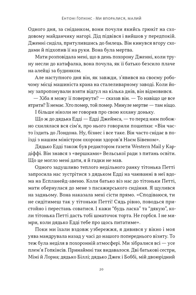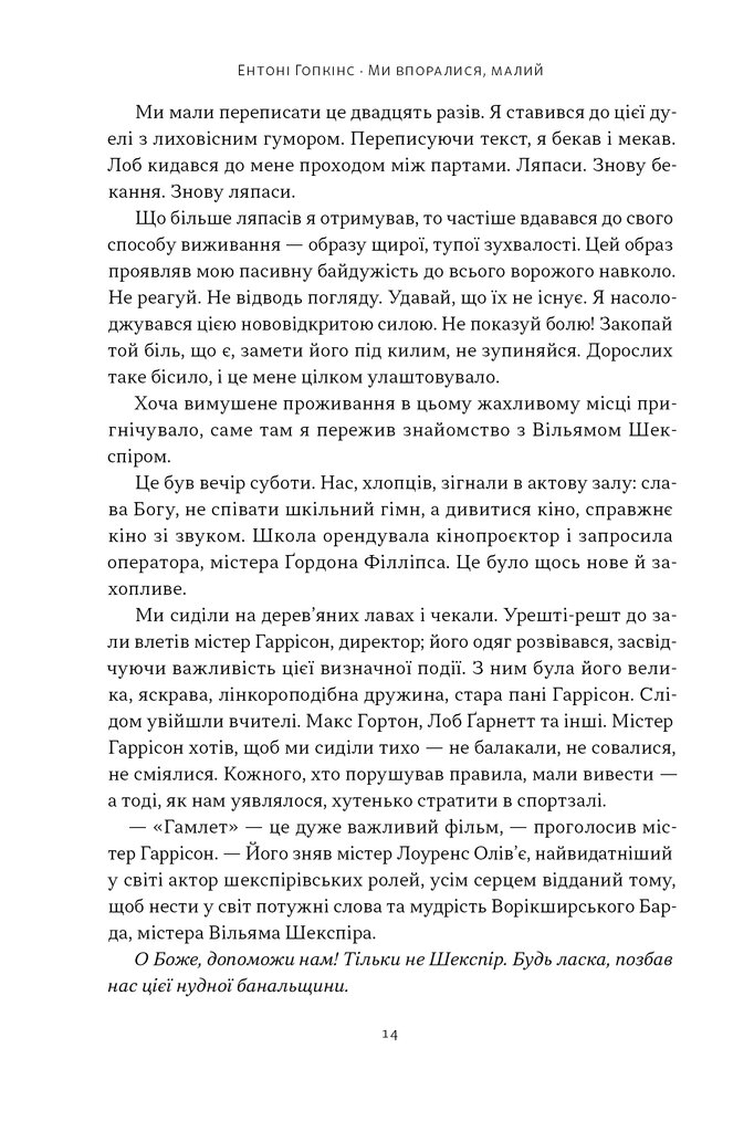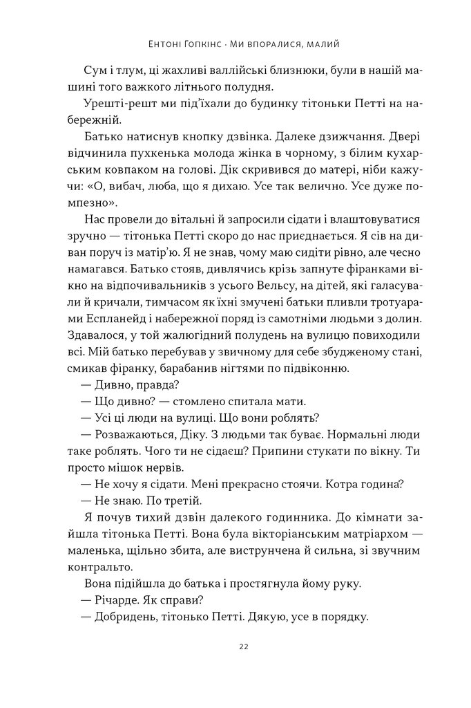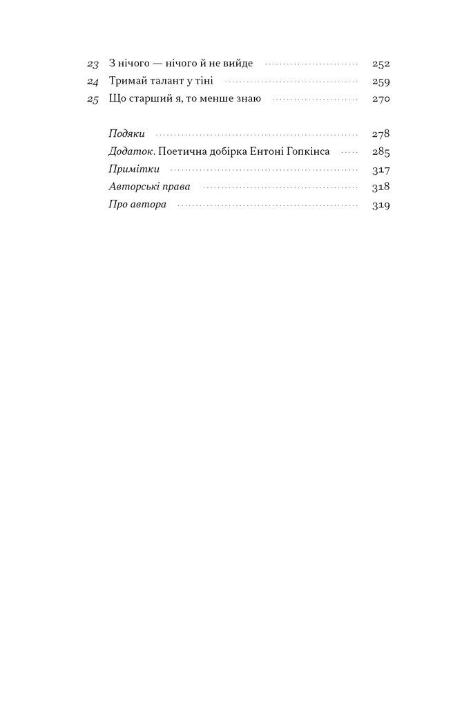 Ентоні Гопкінс також відверто описує найтемніші сторінки свого життя: залежність від алкоголю, невдалі шлюби, зіпсовані стосунки з єдиною дитиною. Ця книжка — щира й пристрасна сповідь складної культової особистості, яка понад шістдесят років надихає публіку своїми видатними ролями.