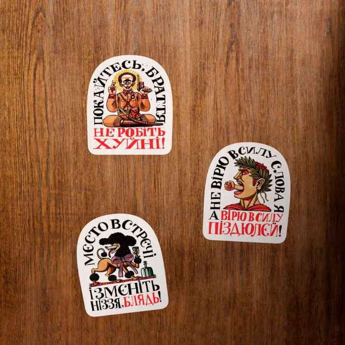 Для наклейок Митець ми вибрали шість яскравих цитат з творчості письменника на будь-який випадок, смішний і не дуже. Наклей стікери на ноутбук або інші помітні поверхні — нехай більше людей дізнається про великого драматурга і посміхнеться. Тому що в наклейках Митець — правда життя — гірка, гостра, влучна. Лесь знає, бо він життя прожив!