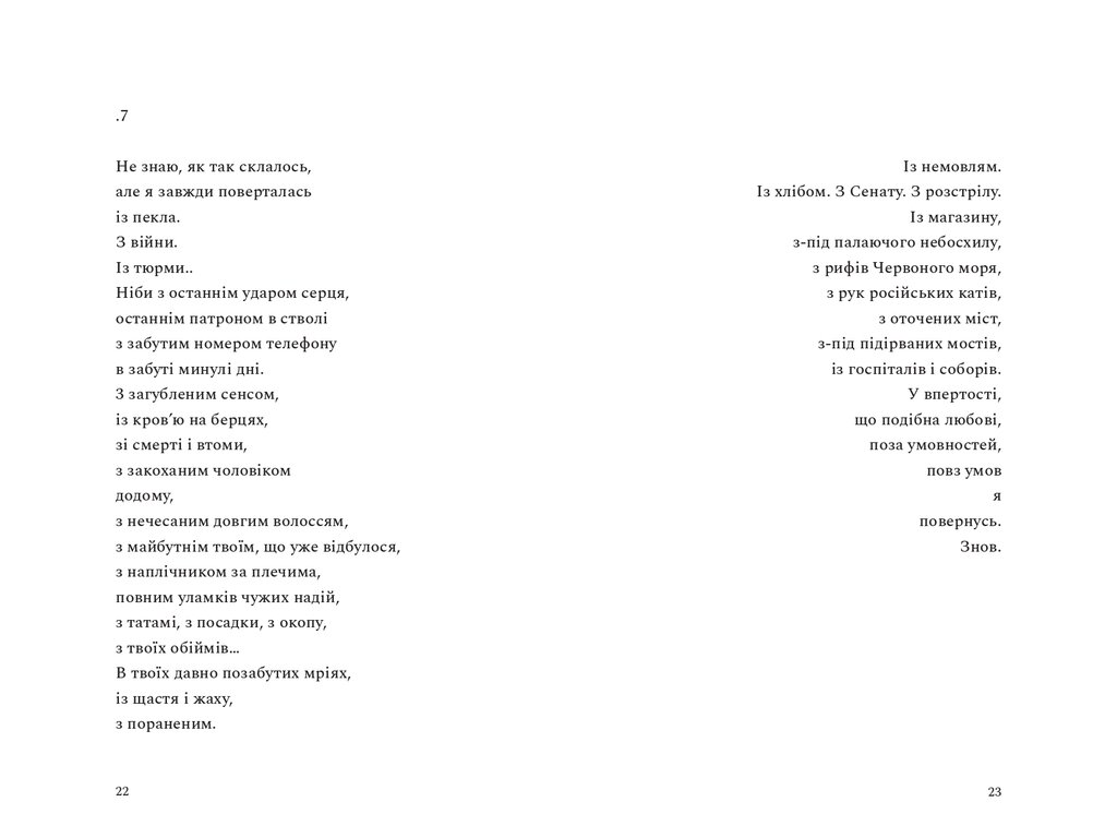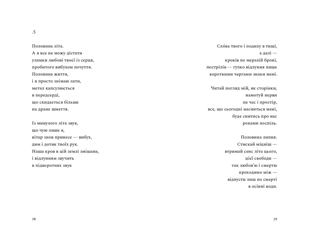 Це тексти, написані між евакуацією поранених, любов’ю і катівнями та перельотами між континентами. Поезія, яка не просить співчуття. Вона — дух епохи.