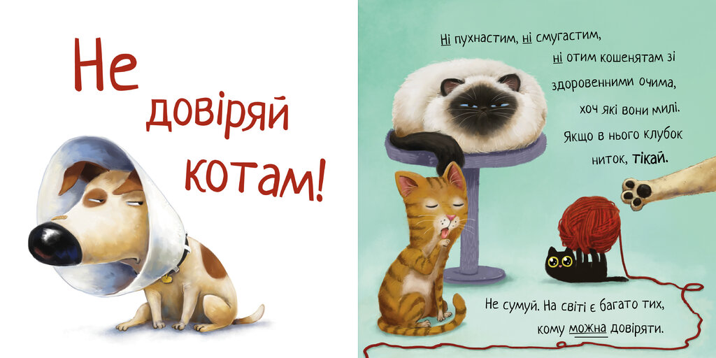 Натомість довіряй білці, за якою вічно ганяєшся, довіряй дідусю (хоч той і махлює в картах, зате завжди тебе пригощає), а ще — отому скунсу (він здається товариським, хіба може щось піти не так?). Та НЕ довіряй котам, особливо Мурчику.