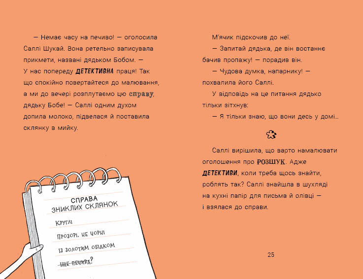 Відомий британський письменник Філіп Арда описує пригоди Саллі Шукай та її вірного пса М’ячика. Саллі Шукай — юна детективка з надзвичайною уявою. М’ячик — незмінний партнер у її розслідуваннях. Цього разу дует відкриває тимчасову штаб-квартиру в домі дядька Боба але злочини, як завжди, поруч. Підозрювані з’являються миттєво, докази вигадуються ще швидше, а самі пригоди дедалі божевільніші. І хоча ці детективи постійно захоплюються вигадками, цього разу вони таки натрапляють на справжнього злочинця!