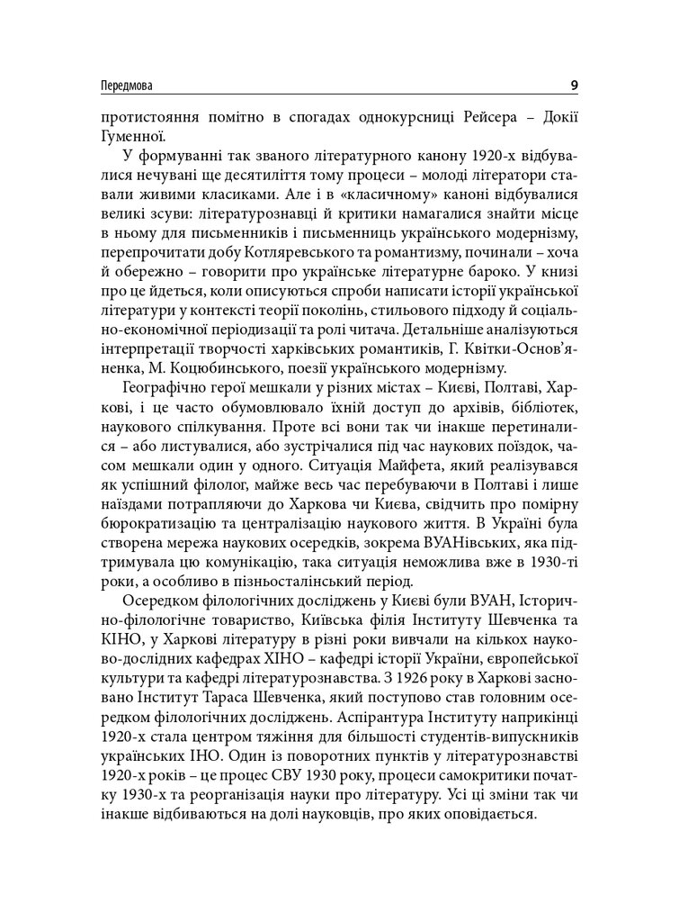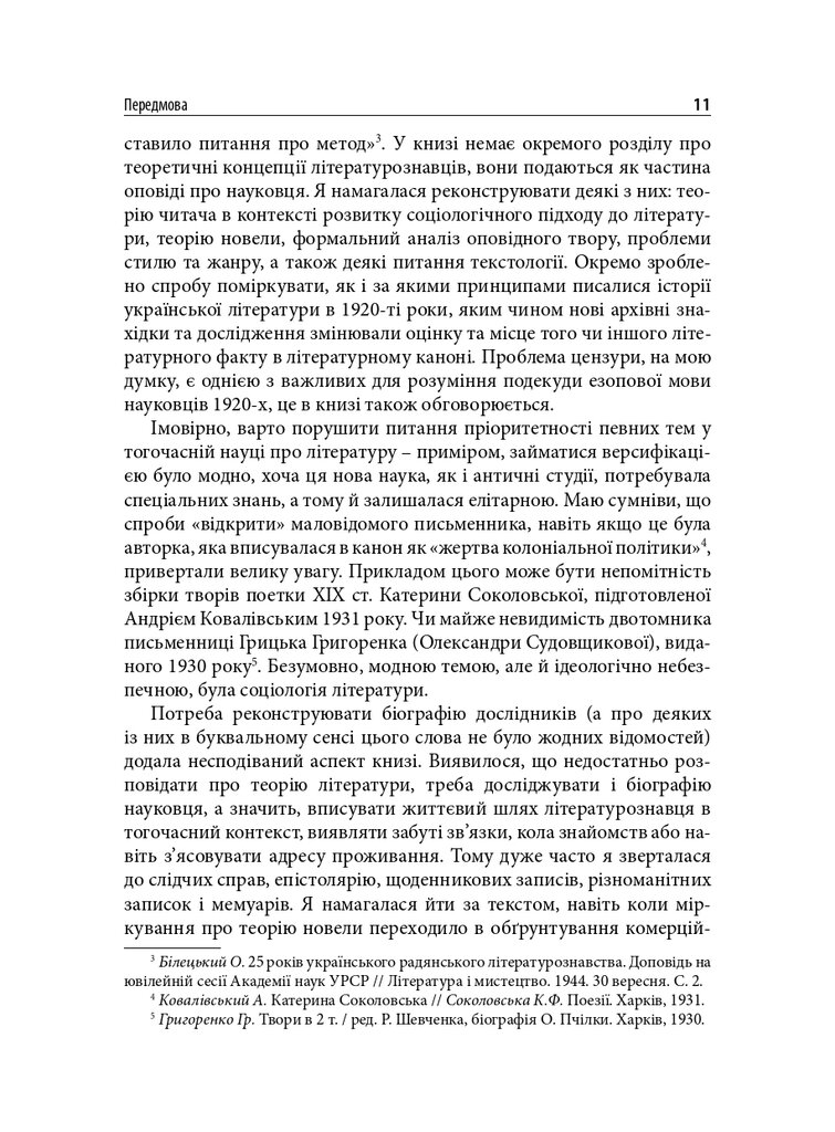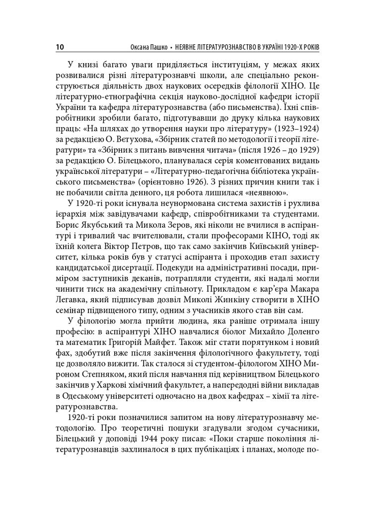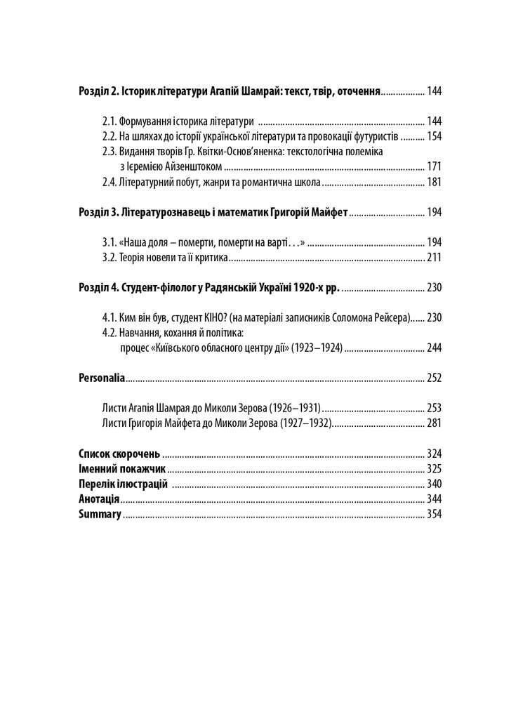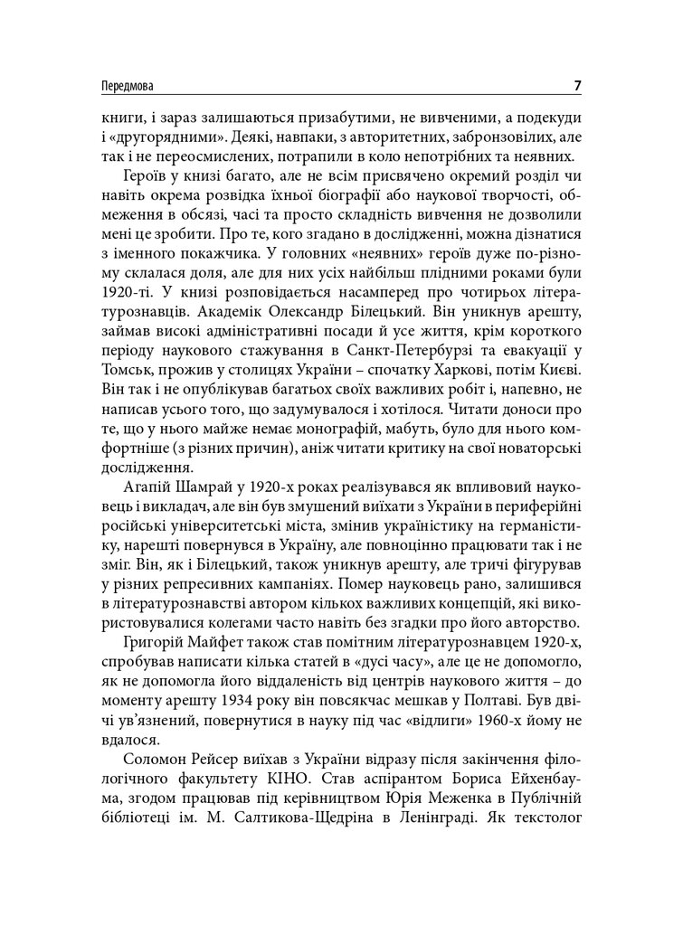 Книгу присвячено маловідомим сторінкам українського літературознавства 1920-х років. У центрі уваги – філологічна школа Олександра Білецького. Розглянуто концепції науковця про типологію читача, стильовий підхід до написання історії літератури, а також реконструйовано діалог-полеміку з Дмитром Чижевським. У розділі, присвяченому Агапію Шамраю, представлено як життєпис дослідника, так і його літературознавчі теорії – насамперед інтерпретації раннього українського романтизму. Окрему увагу приділено теорії новели у працях Григорія Майфета та дискусіям довкола неї у тогочасній періодиці. Побут і наукові пошуки студента-філолога розглянуто на прикладі київського періоду життя майбутнього текстолога Соломона Рейсера. Микола Зеров постав як повноцінний герой оповіді, але з’являється він як адресат листів Шамрая та Майфета.
