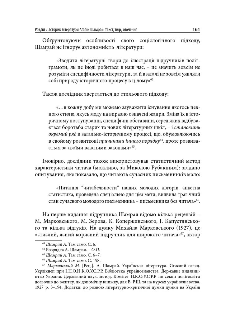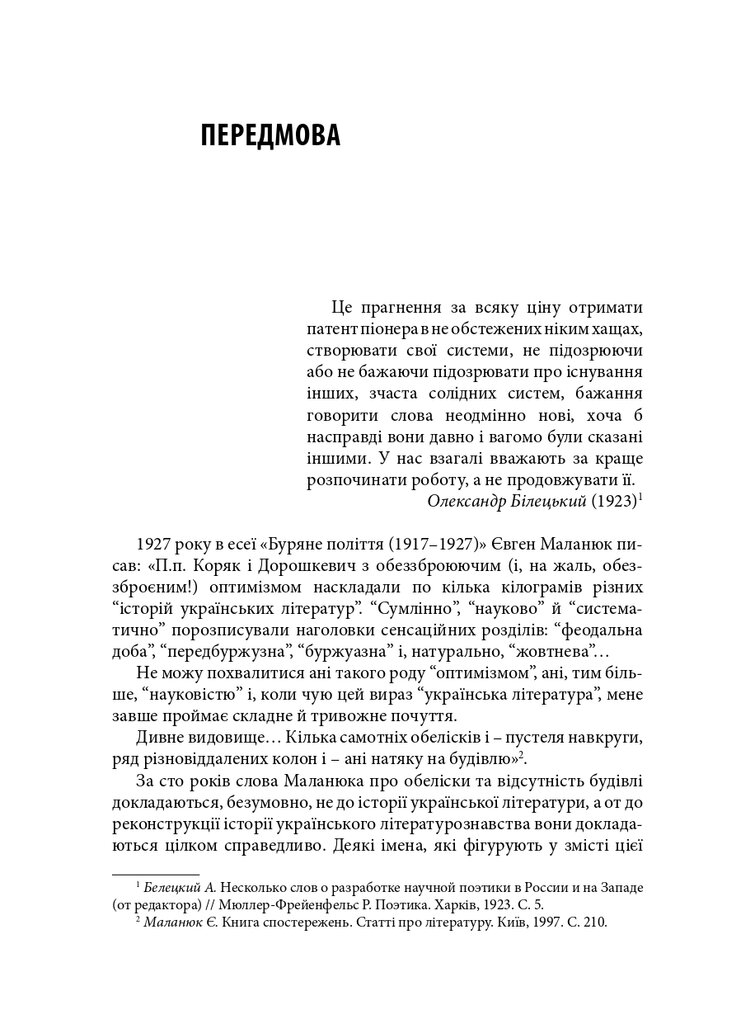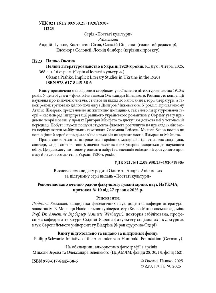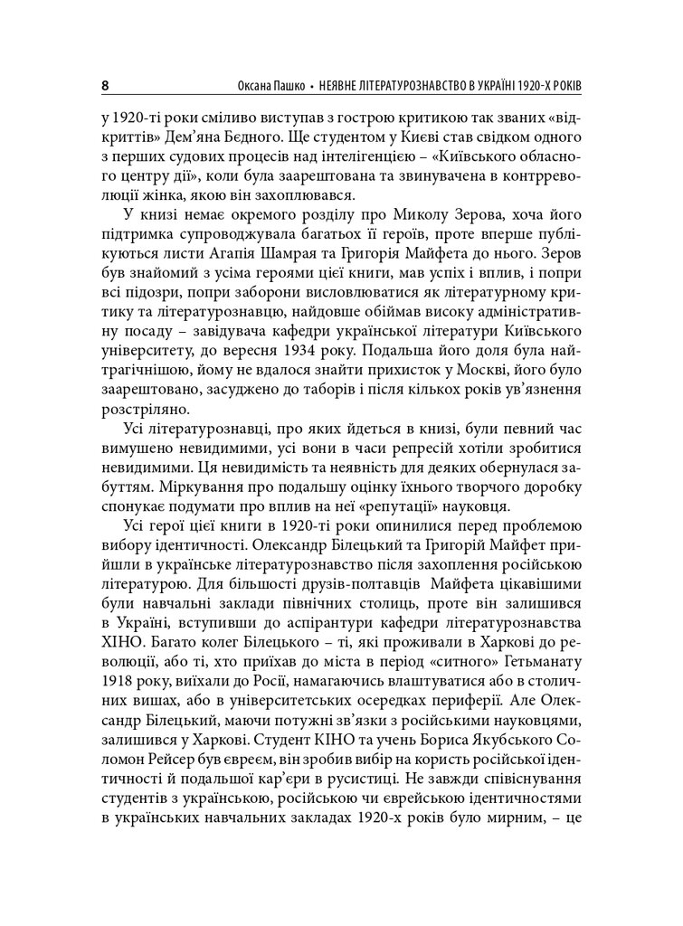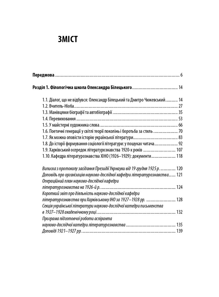 Книгу присвячено маловідомим сторінкам українського літературознавства 1920-х років. У центрі уваги – філологічна школа Олександра Білецького. Розглянуто концепції науковця про типологію читача, стильовий підхід до написання історії літератури, а також реконструйовано діалог-полеміку з Дмитром Чижевським. У розділі, присвяченому Агапію Шамраю, представлено як життєпис дослідника, так і його літературознавчі теорії – насамперед інтерпретації раннього українського романтизму. Окрему увагу приділено теорії новели у працях Григорія Майфета та дискусіям довкола неї у тогочасній періодиці. Побут і наукові пошуки студента-філолога розглянуто на прикладі київського періоду життя майбутнього текстолога Соломона Рейсера. Микола Зеров постав як повноцінний герой оповіді, але з’являється він як адресат листів Шамрая та Майфета.