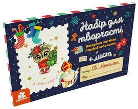 Набір містить: лист Святому Миколаю, двобічну кольорову листівку з привітанням, покрокову інструкцію, смужки паперу, кольоровий папір, стрічку, півнамистини, клейкі стрази, ґлітер, джгут, клей ПВА.
