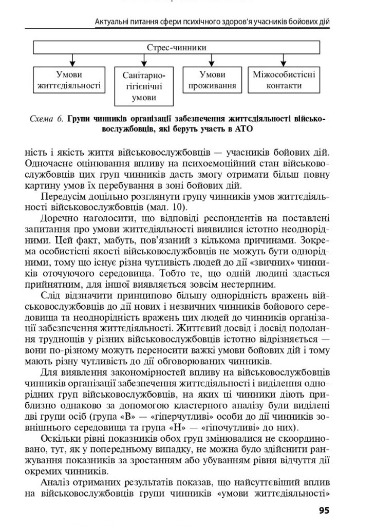 Розкрито актуальні питання сфери психічного здоров’я учасників бойових дій на Сході України. Зокрема описано вплив чинників бойового середовища на військовослужбовців, клініко-психологічні характеристики посттравматичного стресового розладу, аддиктивні розлади, суїцидальні випадки, контузії та постконтузійний синдром. Наведено програму комплексної диференційованої терапії ПТСР у військовослужбовців. Особливу увагу приділено психологічній корекції порушень здоров’я сім’ї учасників бойових дій.
