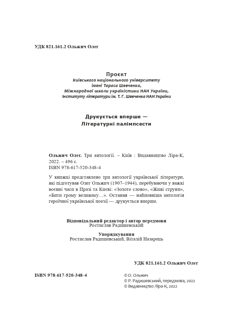 У книжці представлено три антології української літератури, які підготував Олег Ольжич (1907-1944), перебуваючи у важкі воєнні часи в Празі та Києві «Золоте слово», «Живі струни», «Бити грому великому.». Остання - найповніша антологія героїчної української поезії - друкується вперше.