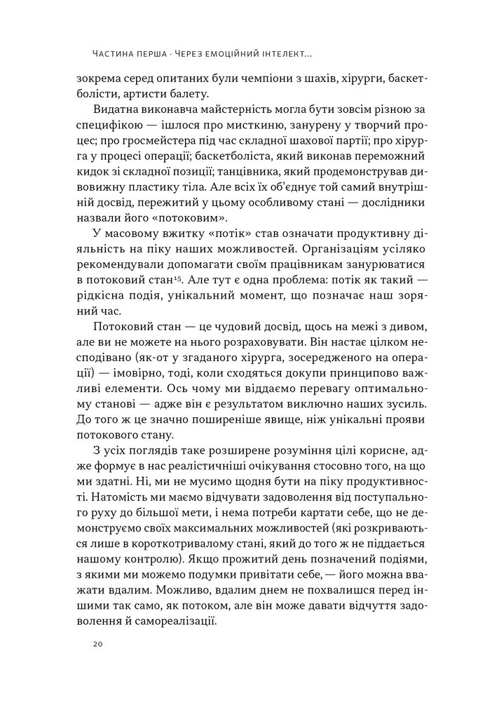 Одним із вирішальних складників оптимального стану людини є усвідомлене ставлення до емоцій, тобто емоційний інтелект. Саме він допомагає реалізовувати наші можливості й отримувати задоволення від того, що робиш, не піддаючи себе постійному прискіпливому оцінюванню.