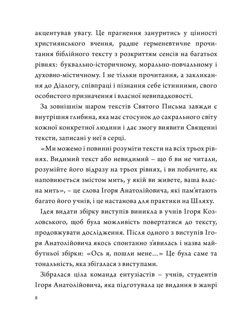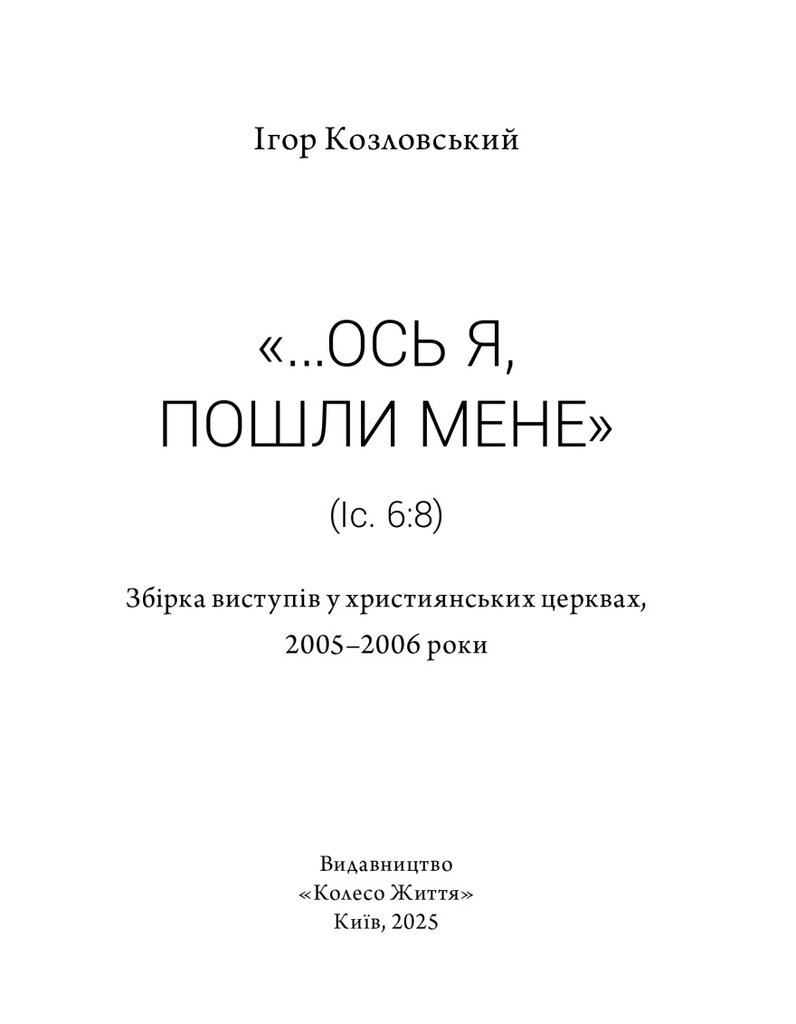 Перший том тритомної збірки Ігоря Козловського «Ось я, пошли мене». Це збірка публічних виступів, лекцій і промов Ігоря Козловського, виголошених у християнських спільнотах і культурно-освітніх середовищах у середині 2000-х і пізніше. Книга фіксує «живе слово» автора, це розмова-міркування, де віра і знання поєднані у практику внутрішньої роботи серця.