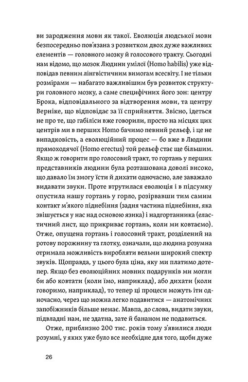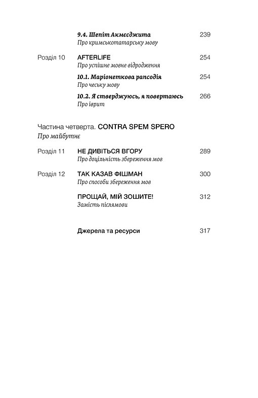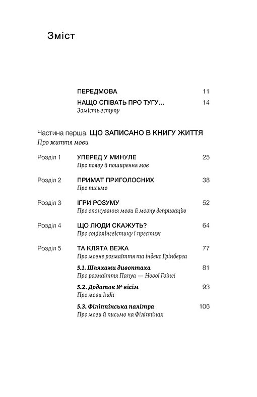 Від теорій походження мови та методів її дослідження до конкретних людських доль. У книжці поруч з індексом Джозефа Грінберга й експериментом Вільяма Лабова — розповіді про беззубого далматинця та вулкан, що знищив мову, про маріонеток у Чехії й афери мобільних операторів у Мексиці, про тайські греблі та чилійських бабусь. Автор говорить про останніх носіїв забутих мов, жіноче письмо в Китаї та відродження івриту.