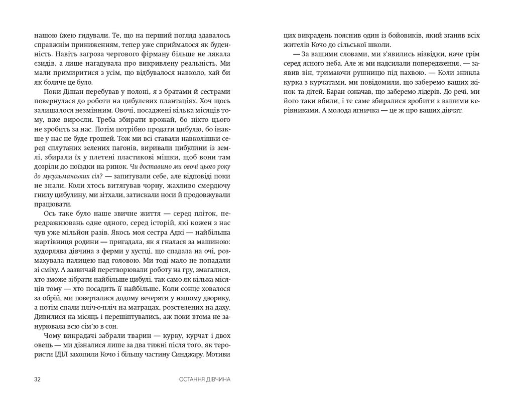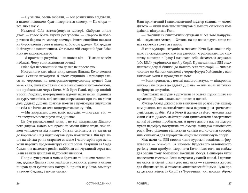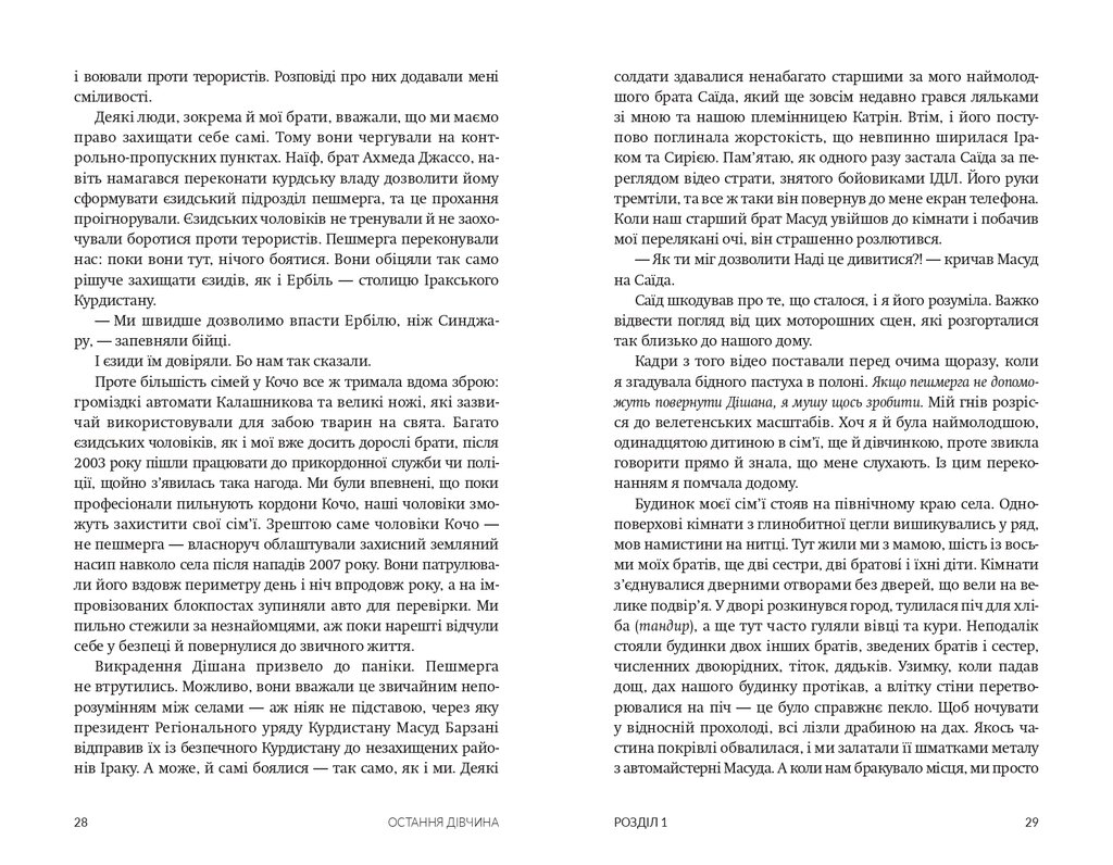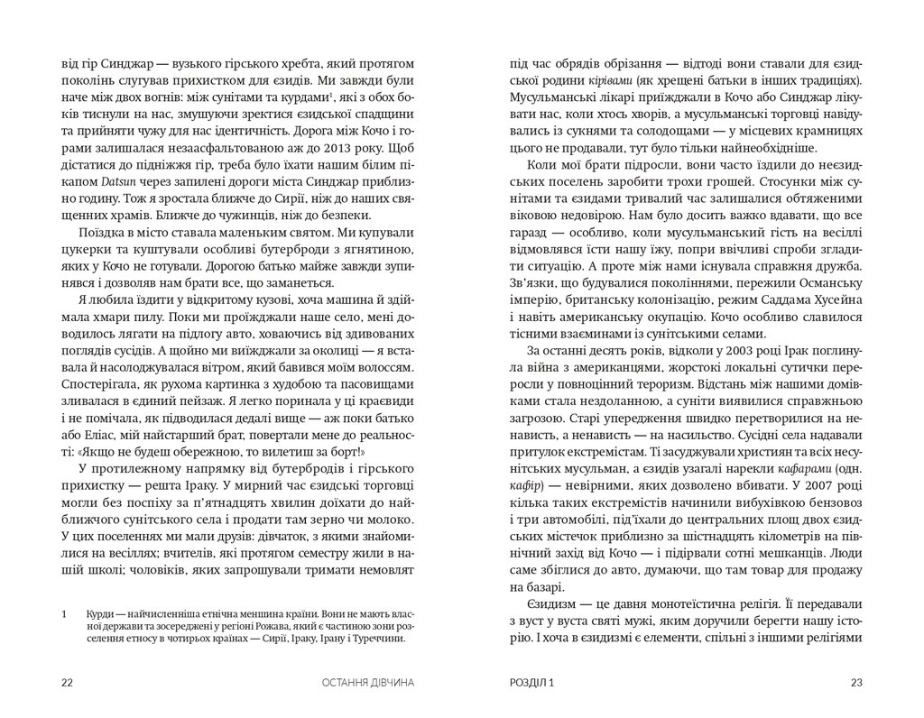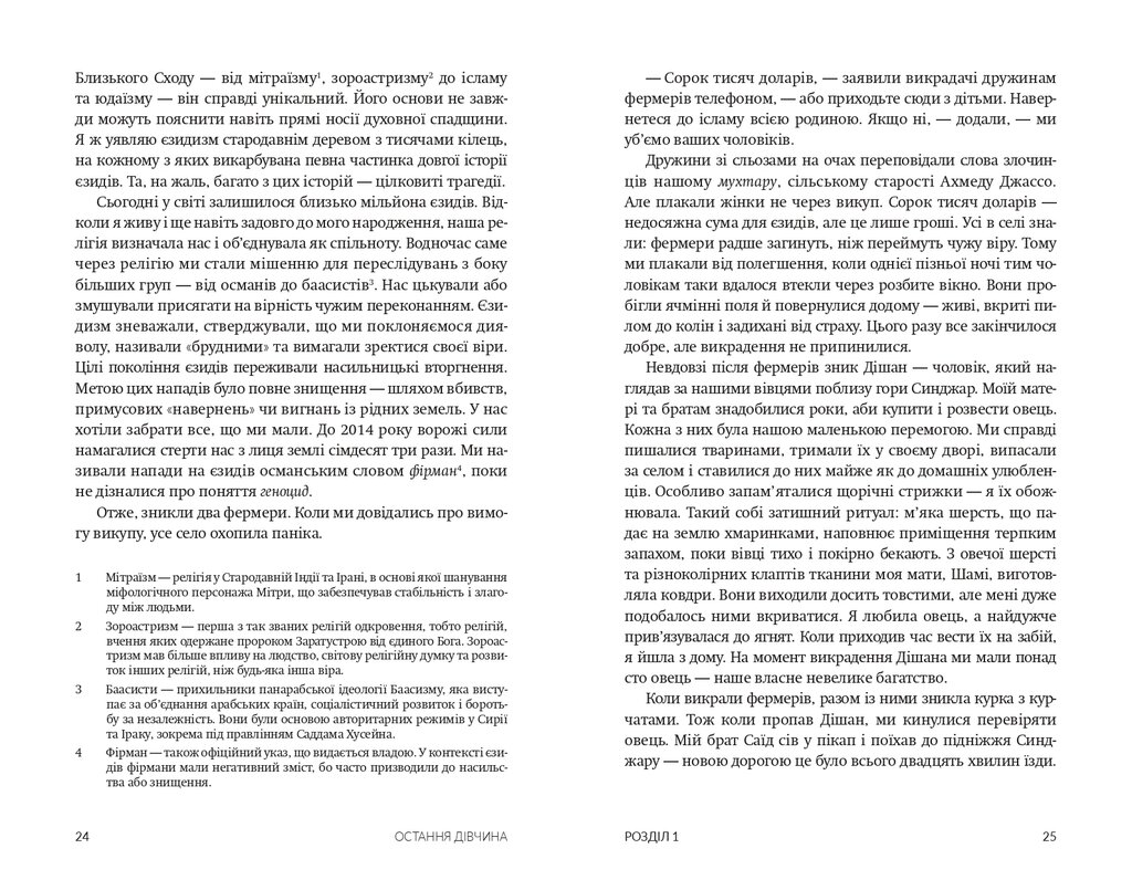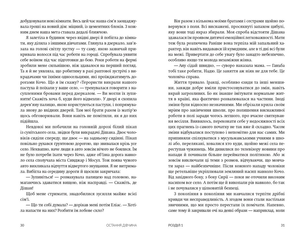 Надя Мурад — іракська правозахисниця, лауреатка Нобелівської премії миру 2018 року за боротьбу проти сексуального насилля у збройних конфліктах. «Остання дівчина» — її мемуари про виживання у полоні Ісламської держави.