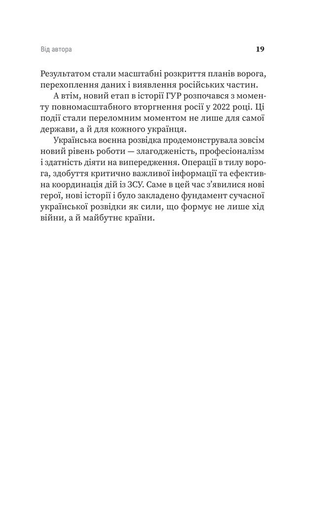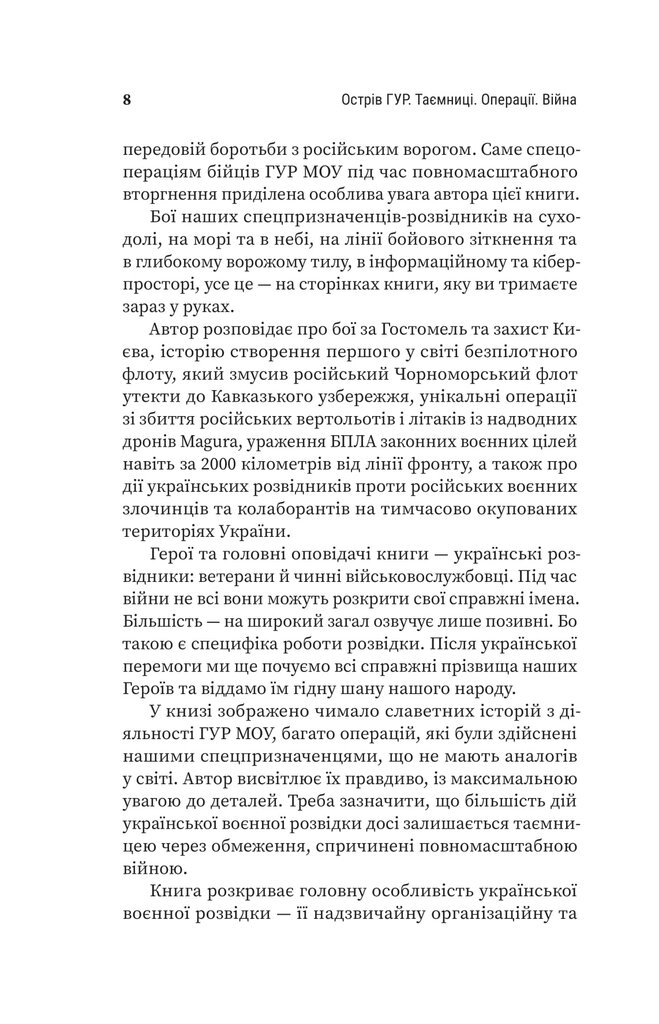Загарбницька війна росії з Україною триває з 2014 року. Всі ми є свідками потужної оборонної здатності наших Збройних Сил. З моменту повномасштабного вторгнення росії у 2022 році особливу роль відіграє українська воєнна розвідка, яка демонструє надвисокий рівень роботи — злагодженість, професіоналізм і здатність діяти на випередження. Операції в тилу ворога, здобуття критично важливої інформації та ефективна координація дій із ЗСУ — в основі сюжету цієї книги. Сучасна українська розвідка — це та сила, що формує не лише хід війни, а й майбутнє країни.
