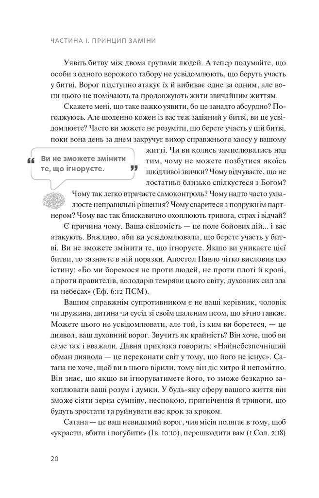 Всі ми намагалися позбутися шкідливих звичок і нездорових моделей мислення, але опинялися в глухому куті через те, що мозок вийшов з-під контролю, а щоденне життя погрузло у рутині. Крег Грошел глибоко розуміє нашу щоденну боротьбу з негативним мисленням. У цій книжці він розкриває стратегії, які допоможуть змінити не тільки вашу свідомість, але й усе ваше життя. Спираючись на Біблію та найновіші відкриття науки про мозок, автор висвітлює практичні стратегії, які звільнять вас від тиску шкідливих та деструктивних думок і дозволять жити життям радості й миру — тим життям, яке Бог призначив вам.