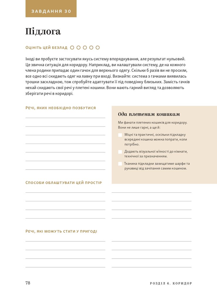 Клеа Ширер і Джоанна Теплін повернулися з цікавим, практичним робочим зошитом, який допоможе розпочати вашу домашню організацію. Ось 52 завдання для кожної кімнати — від очищення шухляди від непотрібних речей до вимірювання шафи на наявність ящиків для зберігання речей і розташування додатків на телефоні за кольором.Робочий зошит структурований таким чином, що ви можете вирішувати одне завдання на тиждень або обійти весь дім за кілька місяців, і містить: