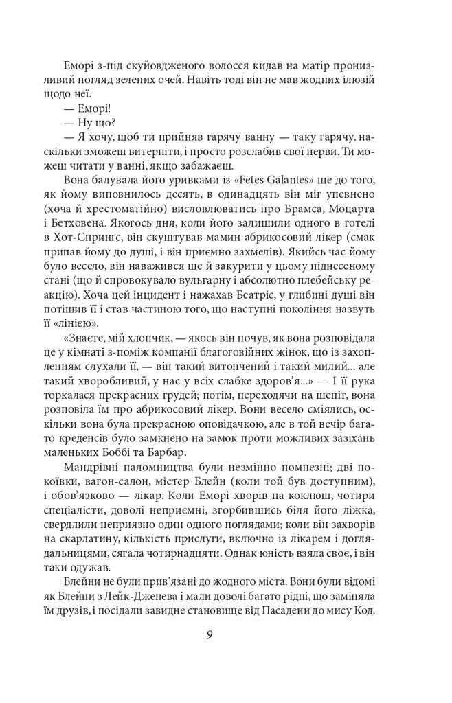 Роман «По той бік раю» — це історія зайвої людини по-американськи. Еморі Блейн мав чудову освіту, великі гроші, звик отримувати все, чого бажає. Але смерть товариша, розорення сім’ї, неможливість через бідність одружитися з коханою дівчиною цілком змінюють його характер.
