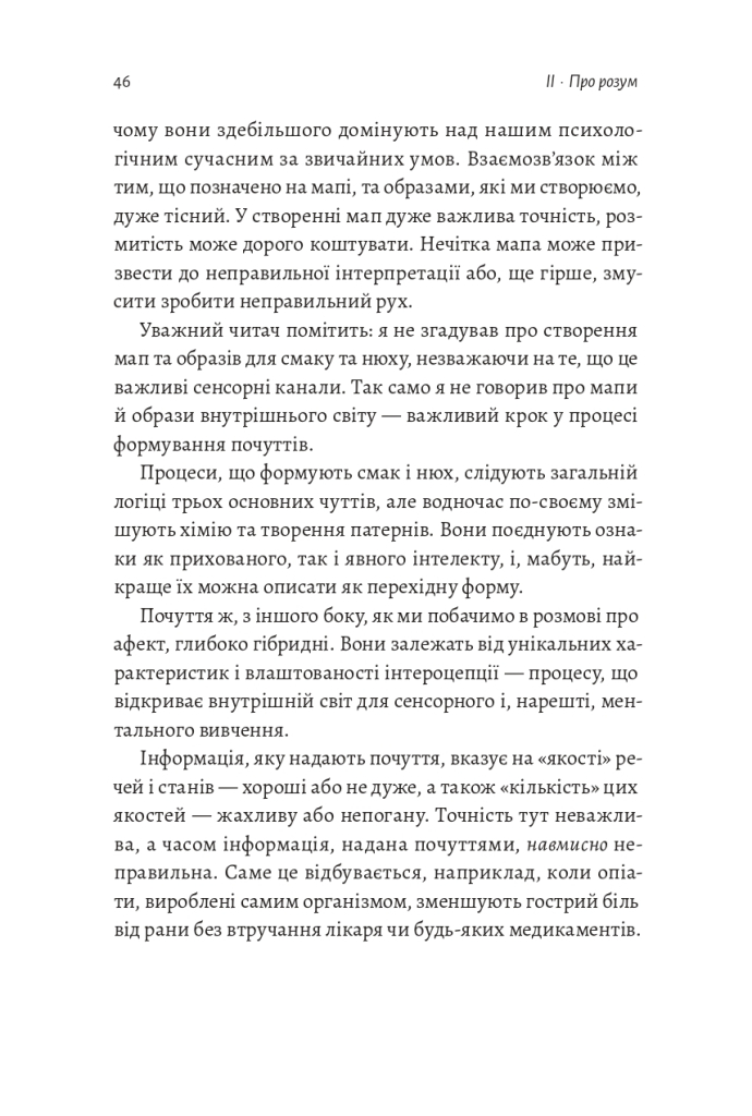 Базуючись на досягненнях в галузі біології та соціальних наук, автор проводить цікаві паралелі між одразу кількома сферами знань і пояснює зв’язки між розумом і почуттями, свідомим і підсвідомим, тілом і нервовою системою.