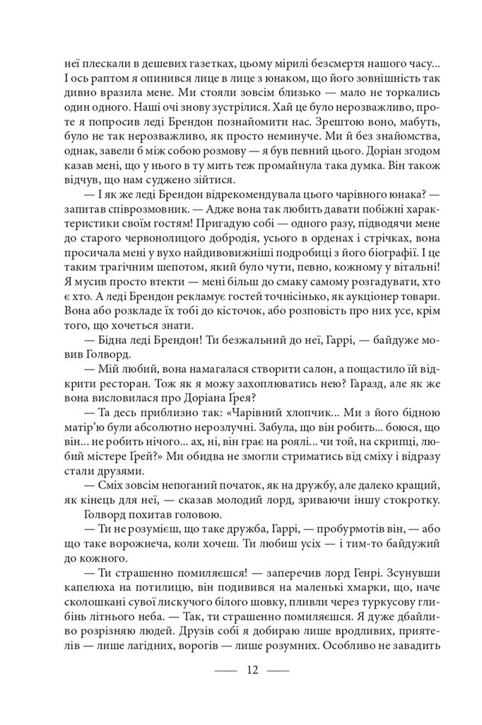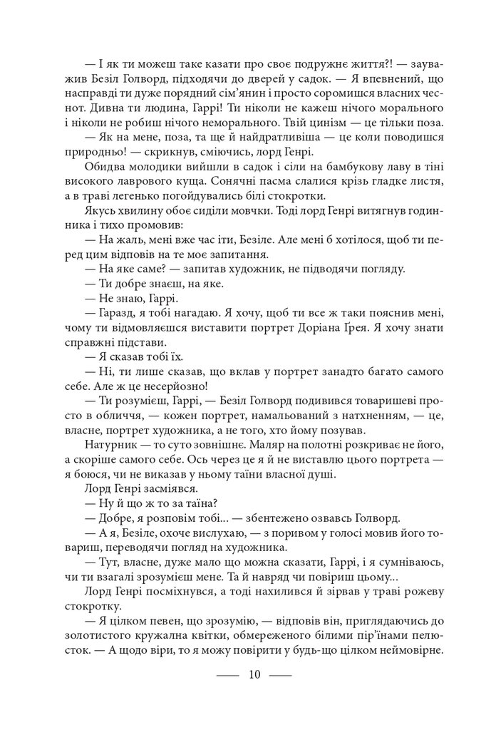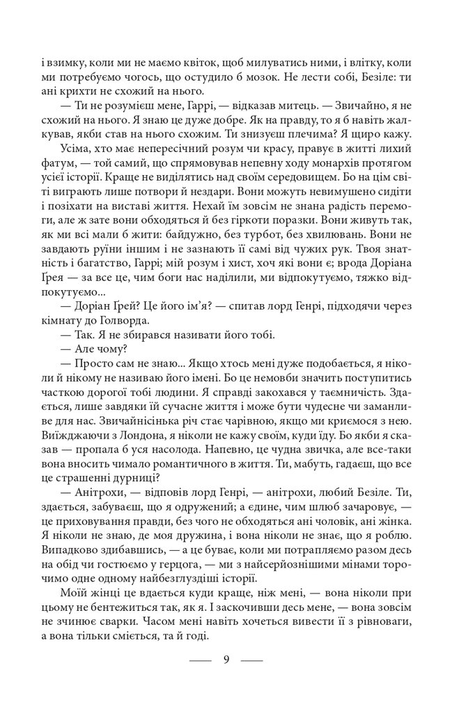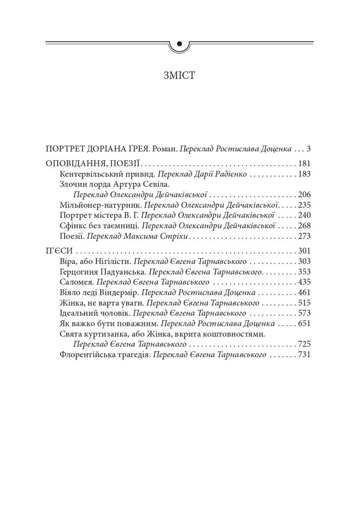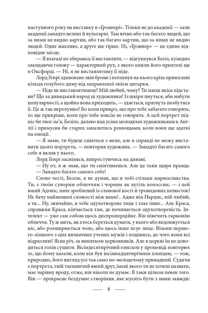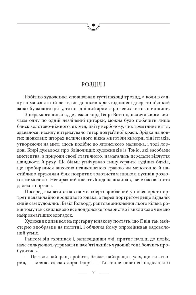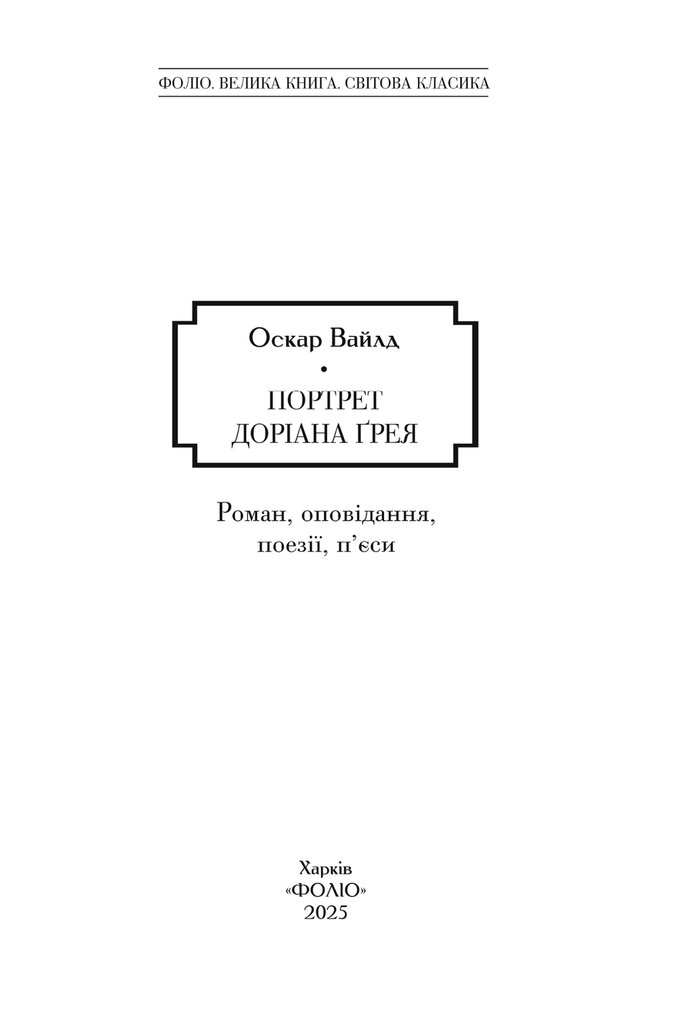 Єдиний роман Вайлда — «Портрет Доріана Ґрея», написаний за рекордно короткий термін — лише за три тижні, викликав гучний резонанс, зробив автора надзвичайно відомим, водночас збуривши тогочасне суспільство. Доріан, неймовірно вродливий юнак, одного разу, милуючись власним портретом, побажав, щоб його зображення старішало замість нього. Це бажання здійснилось: обличчя Доріана зберігало юність, хоча сам він занурювався у порок і розпусту, а портрет натомість змінювався, відображаючи його справжню суть. Та розплата не забарилась... До видання також увійшли оповідання, поезії та п’єси Оскара Вайлда.