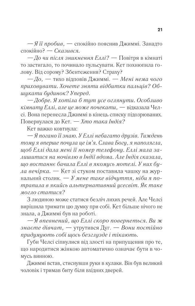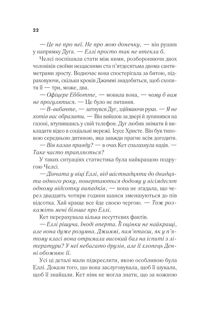 Еллі Блек зникла кілька років тому. І от її знайшли живою в лісі в штаті Вашингтон. Здається, з дівчиною все гаразд, але вона не розповідає, де була й що сталося. Її повернення перевертає догори дриґом життя детективки Челсі Калгун. Її сестра-підлітка зникла майже двадцять років тому, і відтоді жінка шукає: докази, розгадку, інших зниклих дівчат. Щасливі кінцівки рідко трапляються в роботі Челсі, тож повернення Еллі Блек — проблиск надії. Детективка має дізнатися, що сталося з Еллі: заради себе, заради пам’яті про сестру, а головне — заради наступної дівчини, яку викрадуть і яка, на відміну від Еллі, може не повернутися.