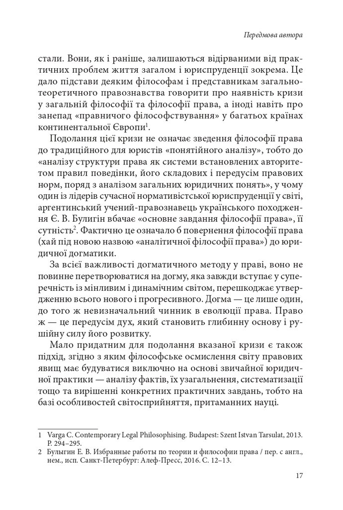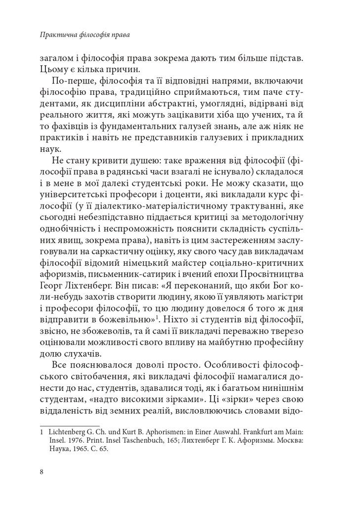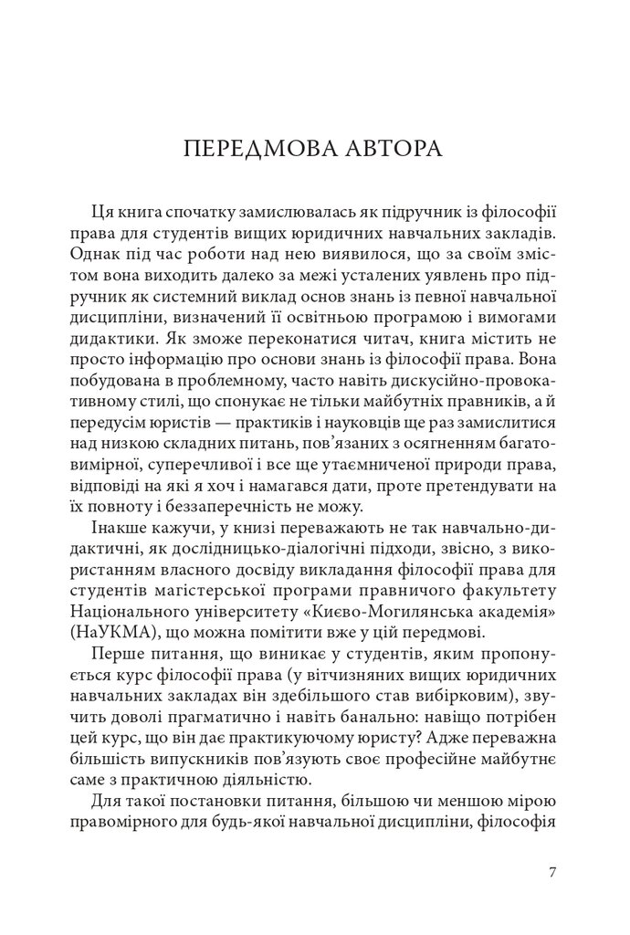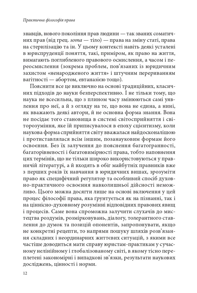 Монографія присвячена аналізу філософсько-практичних аспектів складного, багатобарвного, багатовимірного і все ще значною мірою утаємниченого феномену права. Під цим кутом зору у ній здійснена спроба поглибленого осмислення онтологічної, гносеологічної та аксіологічної природи права, його взаємозв’язків із наукою, релігією, мораллю і мистецтвом. Основна увага зосереджена на демонстрації того, як «працюють» надбання філософії права у процесі практичної юридичної діяльності. З цією метою у монографії використані рішення конституційних судів, Європейського Суду з прав людини й інших судів.
