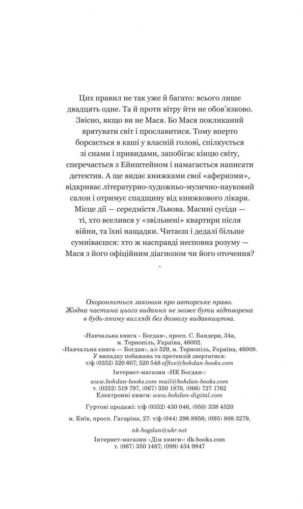 Цих правил не так уже й багато: всього лише двадцять одне. Та й проти вітру йти не обов’язково. Звісно, якщо ви не Мася. Бо Мася покликаний врятувати світ і прославитися. Тому вперто борсається в каші у власній голові, спілкується зі снами і привидами, запобігає кінцю світу, сперечається з Ейнштейном і намагається написати детектив. А ще видає книжками свої «аферизми», відкриває літературно-художньо-музично-науковий салон і отримує спадщину від книжкового лікаря. Місце дії — середмістя Львова. Масині сусіди — ті, хто вселився у «звільнені» квартири після війни, та їхні нащадки. Читаєш і дедалі більше сумніваєшся: хто ж насправді несповна розуму — Мася з його офіційним діагнозом чи його оточення?