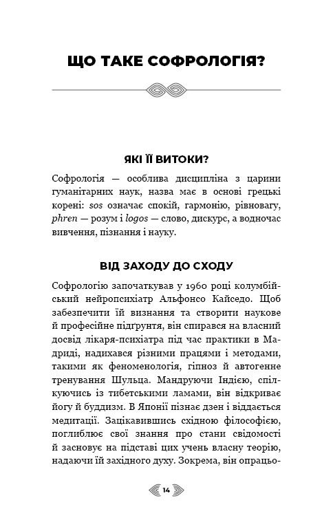 Софрологія — це метод пізнання й потужний інструмент, що об’єднує техніки, характерні як для західної, так і для східної культур. Вона допомагає перетворити наші тривоги й страхи на позитивні думки, знайти приховані ресурси й поліпшити якість життя, без зайвих втрат пережити складні життєві обставини. Мішель Фройд пропонує добірку із 40 вправ, опанування якими дасть змогу достойно впоратися із життєвими проблемами; відновити впевненість у собі, а відтак вдало скласти іспит чи виступити на публіці; подолати стрес, утому та безсоння й повернути радість життя.