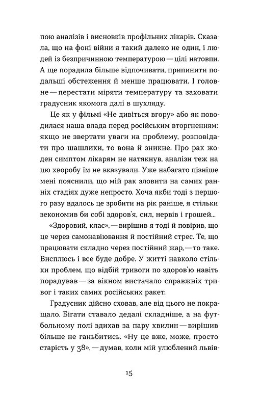 Що робити, коли твоє життя вмить змінюється з діагнозом, і як узагалі лікуватися, коли ракетний обстріл у будь-який момент може перервати процедуру? Як сказати друзям, а потім ще й «вписати» недугу у свій графік? Автор щиро розповідає про те, що відбувалося з ним на кожному етапі боротьби з хворобою, підготуватися до якої неможливо. Віталій ділиться лайфхаками, жартує та пояснює, як краще підтримувати людину, що стикнулася з онкологією.
