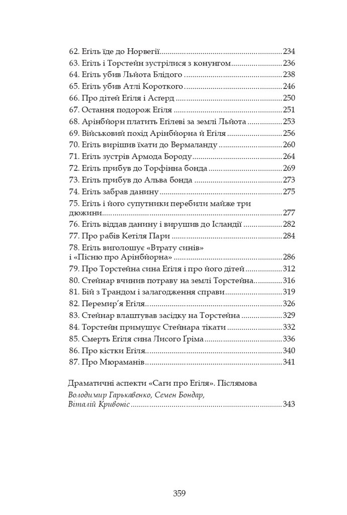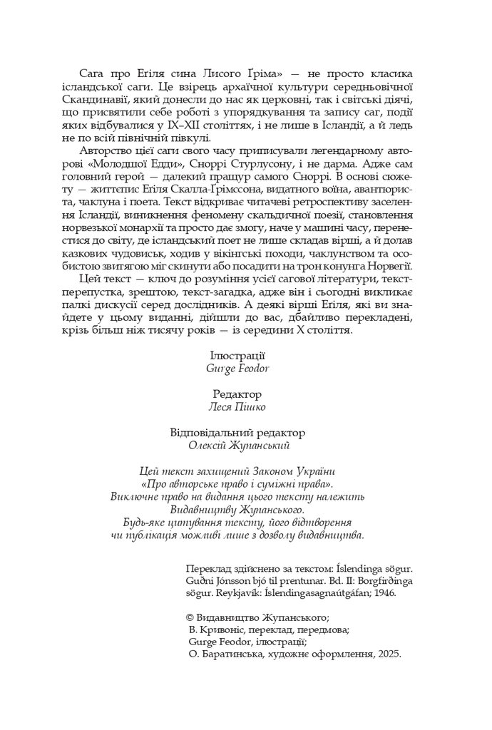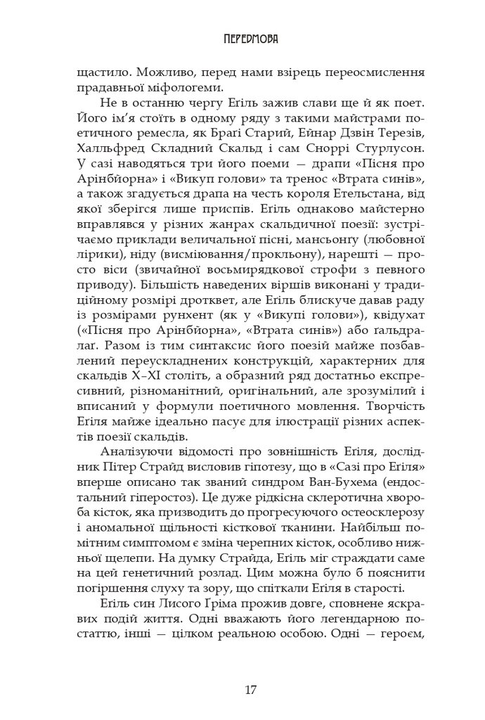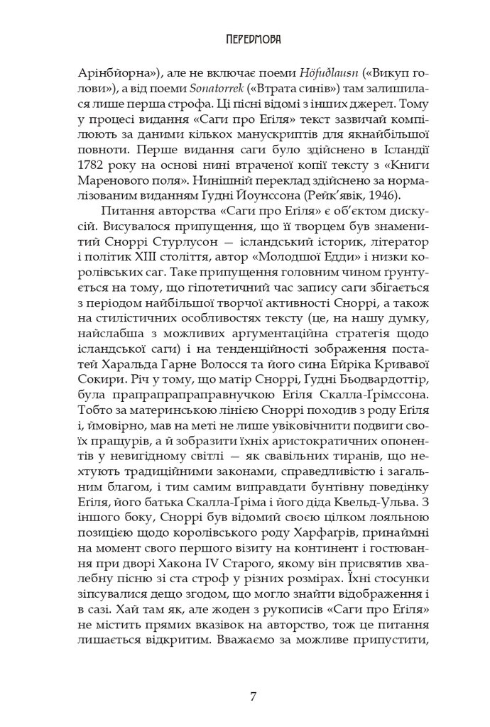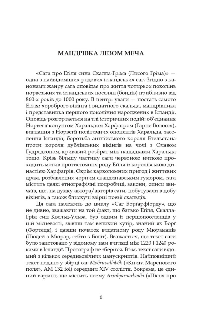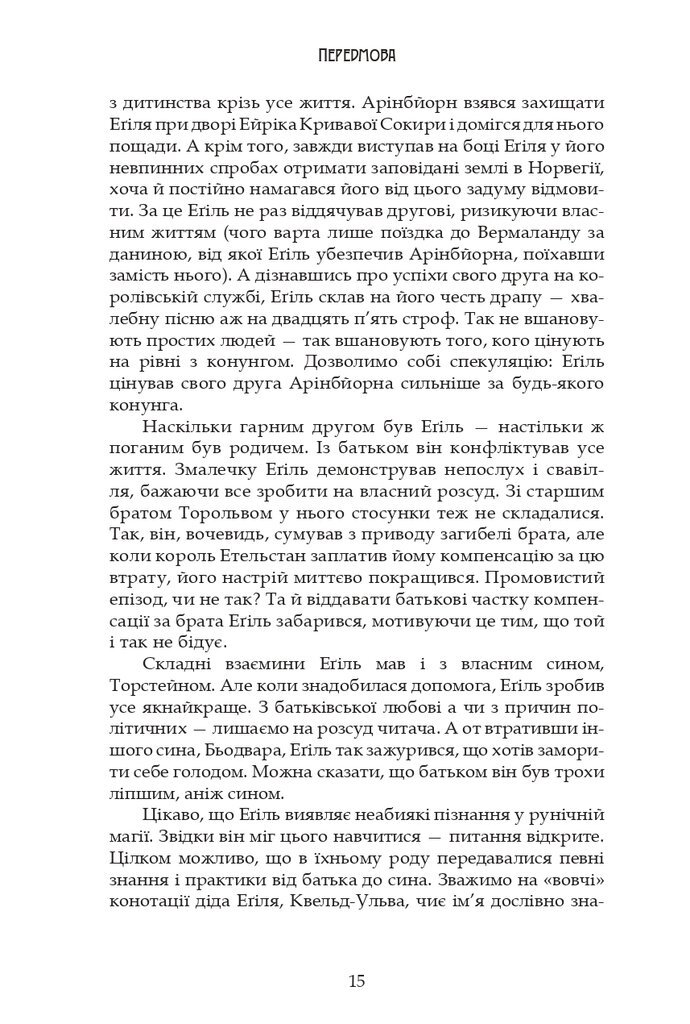 Цей текст – ключ до розуміння усієї сагової літератури, текст-перепустка, зрештою, текст-загадка, адже він і сьогодні викликає палкі дискусії серед дослідників. А деякі вірші Еґіля, які ви знайдете у цьому виданні, дійшли до вас, дбайливо перекладені, крізь більш ніж тисячу років – із середини Х століття.