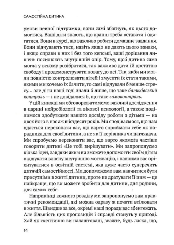 Надто любите свою дитину й тому не сварите її через домашку? Ваша дитина має проблеми з навчанням, синдром дефіциту уваги, страждає на гіперактивність або розлади аутистичного спектру? Намагаєтеся навчити чадо самоконтролю, але марно? Добре, що є ця книжка, бо ви мали б багато клопоту та дитячих сліз! Автори розповідають, як батьки можуть допомогти своїм дітям уникнути стресу й не опустити руки. Їхні поради допоможуть дитині стати самостійною та підійти до межі дорослого життя (перед вступом до коледжу чи університету) з багажем необхідних знань та навичок. Усі історії, наведені в цій книжці, цілком реальні. Це історії дітей, батьків і педагогів, з якими авторам доводилося працювати протягом минулих років. Застосування наведених у книжці методик допоможе вашій дитині навчитися самостійності без істерик, ультиматумів та батьківського пресингу.