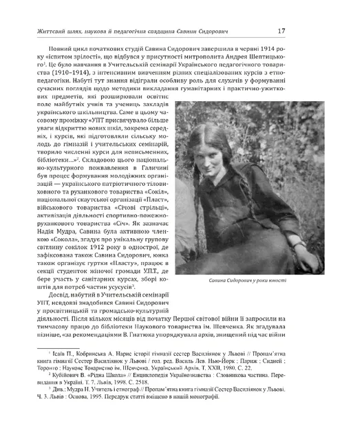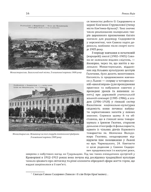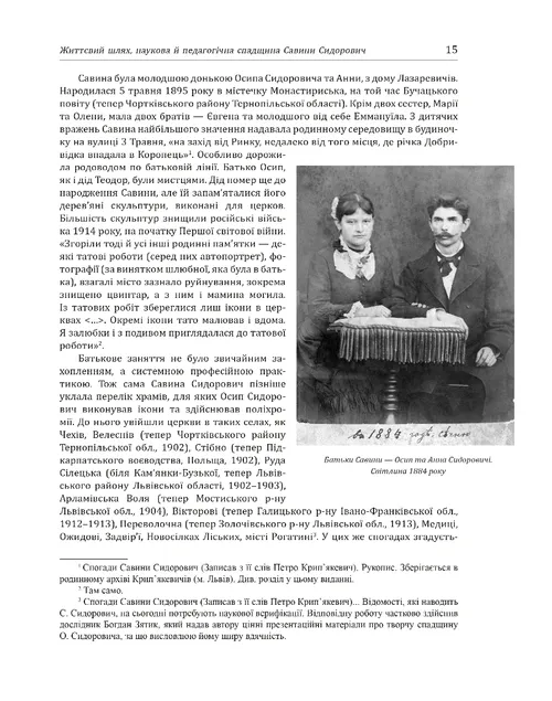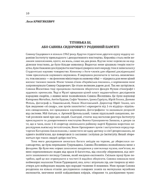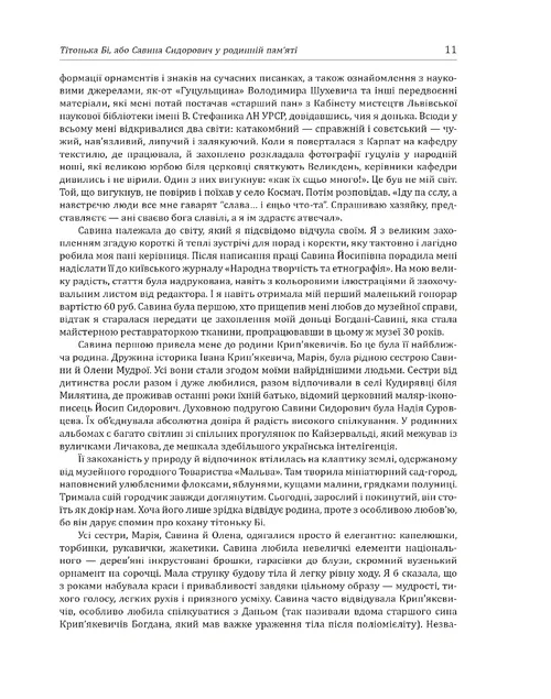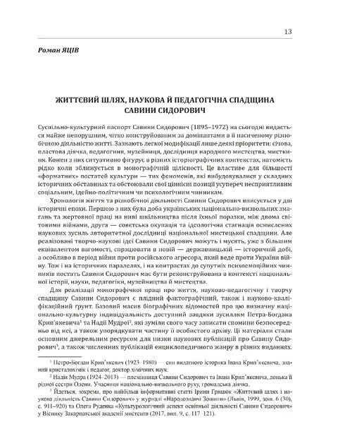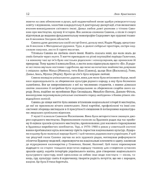 Видання присвячене подвижницькому життю та багатогранній науково-мистецькій спадщині визначної дослідниці українського народного мистецтва Савини Сидорович. Уперше в українській науці постать цієї непересічної особистості представлена в повноті її національно-патріотичного єства, на тлі різних періодів історії, на перетині ідейно-політичних, суспільно-культурних, психологічних, аристократично-генетичних та інших чинників. Монографічне дослідження побудоване на унікальних архівних матеріалах, родинно-біографічних раритетах, споминах близьких та записаних безпосередньо з її розповідей відомостей.
