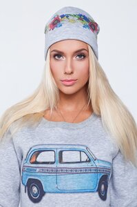 Стильна жіноча шапочка універсального сірого кольору. Сучасний оригінальний принт.