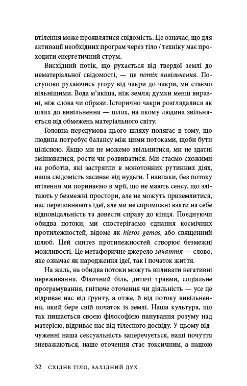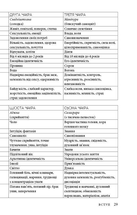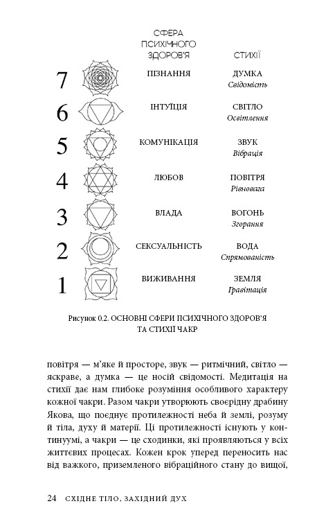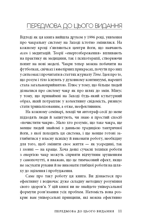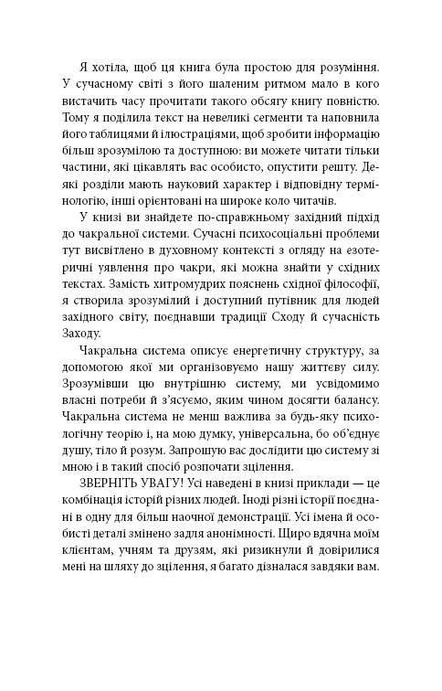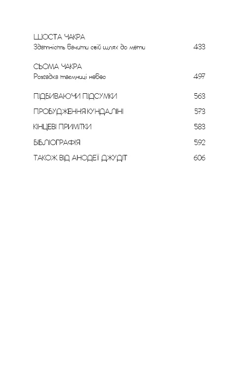 Анодея Джудіт, відома просвітителька, поєднує західні психологію та науку зі східною духовністю, створюючи переконливу інтерпретацію системи чакр для сучасних людей у всьому світі. Спираючись на юнгіанську психотерапію, соматичну терапію, теорії розвитку дитини, метафізику, вона застосовує систему чакр для вирішення сучасних питань, таких як залежність, співзалежність, сімейна динаміка, сексуальність, розширення особистих можливостей тощо. Східну структуру системи чакр у книзі подано як карту, на якій можна накреслити наше західне розуміння індивідуального розвитку. Кожна чакра докладно розглядається в окремому розділі, де описуються її характеристики, досліджуються особливості розвитку від дитинства до зрілості, розглядається вплив травм і життєвого досвіду, а також надаються поради, як зцілити чакру й зберегти життєвий баланс.