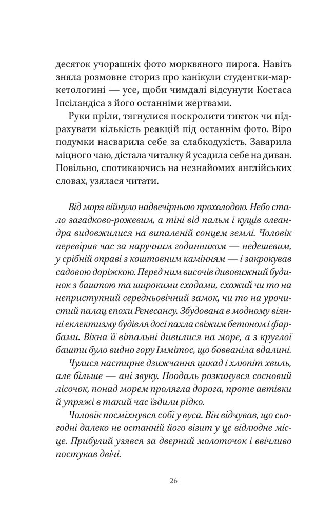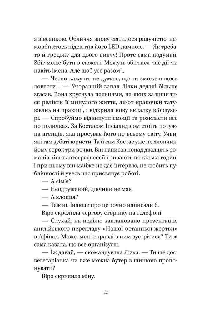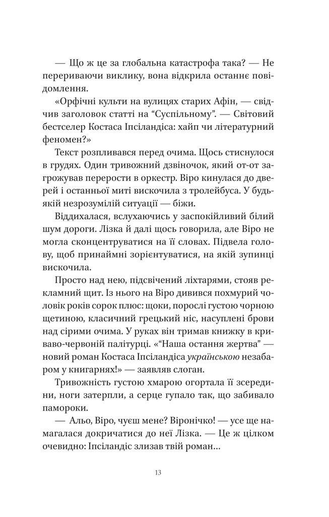 Героїня наважується на подорож до Греції, де відбудеться презентація роману Костаса Іпсіландіса. Вона планувала лишень викрити підступного письменника, а натомість опинилася в епіцентрі власних страхів і небезпек орфічного культу.