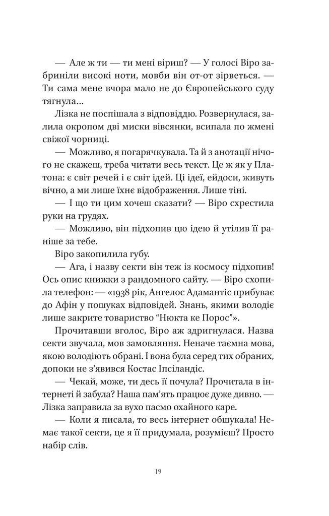 Тож героїня наважується на подорож до Греції, де відбудеться презентація книжки Костаса Іпсіландіса. Вона планувала лишень викрити підступного письменника, а натомість опинилася в епіцентрі власних страхів і небезпек орфічного культу. Химерні сни, закарбовані у викраденому рукописі, виявляються чимось більшим і моторошнішим.