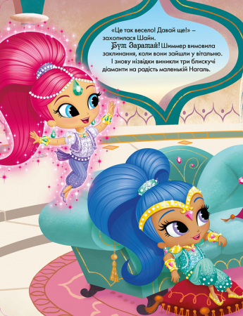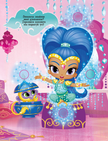 Книжка-картонка, героями якої є магічні джини - близнючки Шиммер і Шайн. Книжку для найменших читачів створено за сюжетом улюбленого яскравого мультфільму "Шиммер і Шайн". Вони полюбляють прикрашати свій палац коштовним камінням! Допоможіть їм зробити кожну кімнату неперевершеною, додаючи нові діаманти джинів на кожну сторінку!