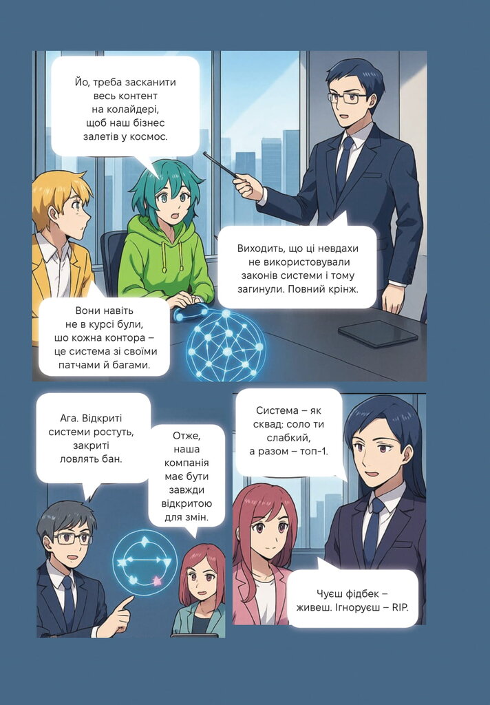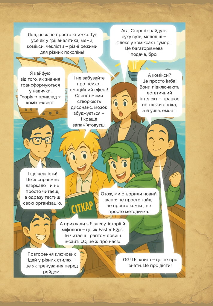 Кроспоколіннєва доступність. Старші — аналітика, молодь — комікси та сленг, менеджери — чеклісти. Книга стає мовним мостом поколінь.