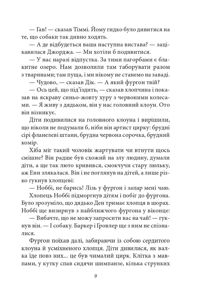 Славетна п’ятірка на двох зручних фургонах вирушає до озера Мерран. Як чудово мандрувати зовсім без дорослих! Джуліан, Дік, Джорджа та Енн влаштовують стоянку неподалік від мандрівного цирку, в якому працює їхній знайомець — хлопчина на ім’я Ноббі. Однак клоун Ден і акробат Лу раптом неабияк незлюбили юних мандрівників, а коли вони ще й спробували отруїти пса Джорджі Тіма, діти зрозуміли, що їхня пригода стає вкрай небезпечною