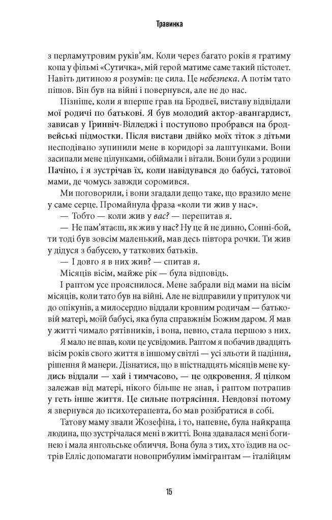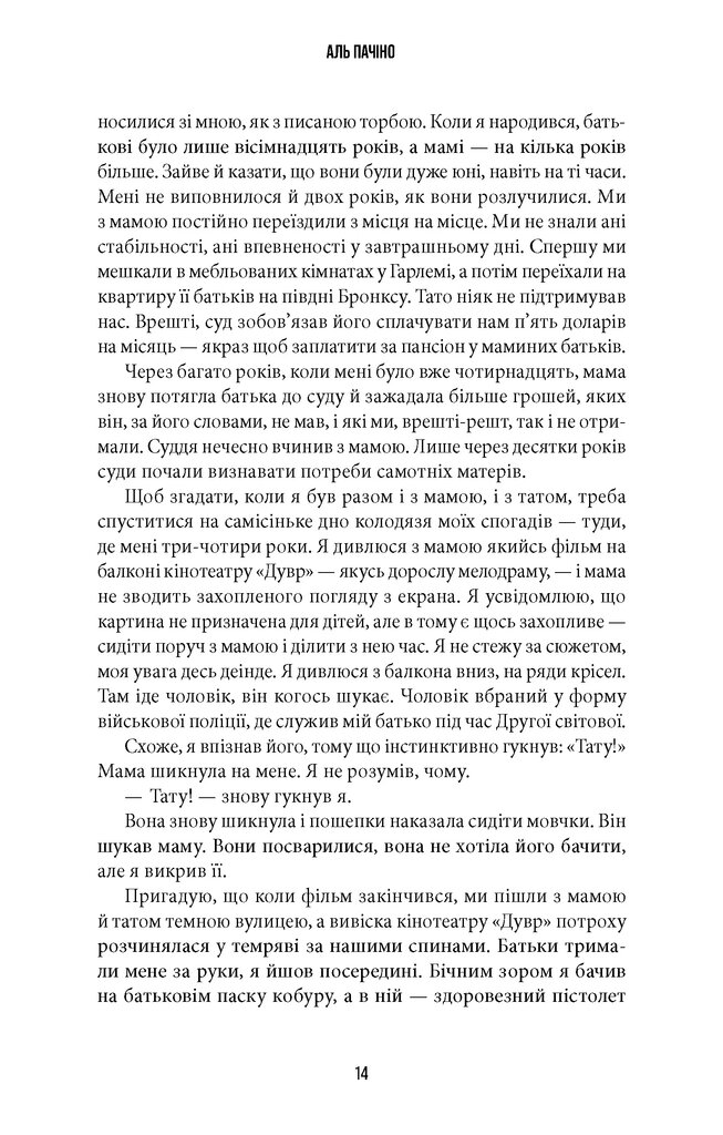 Але тоді Пачіно було вже за тридцять, і його життя навряд чи можна назвати бідним на події. Актор авангардного нью-йоркського театру, він вів богемне життя, перебиваючись випадковим заробітком, щоб присвятити себе мистецтву. Його виростила ніжна, але душевно нездорова мати і її батьки, але головними вихователями стали вулиці південного Бронксу, чий дух залишився з ним назавжди. Вчитель помітив у Пачіно акторські здібності і порадив вступити у знамениту нью-йоркську Вищу школу театральних мистецтв, що вирішило його долю. Акторство стало його покликанням, а актори — його плем’ям, у часи веселі й сумні, у жебрацтві, розкоші і знову в жебрацтві, у радості й горі.