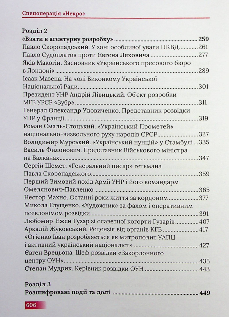 Пів сотні нарисів ґрунтуються на унікальних розсекречених документах із архіву Служби зовнішньої розвідки України. Вони дають змогу дізнатися про досі невідомі епізоди спецоперацій ГПУ/НКВД/МГБ/КГБ СРСР за кордоном проти визначних діячів українського національно-визвольного руху. Зокрема, про першу спробу ліквідувати Андрія Мельника і Степана Бандеру ще у 1944 році в Берліні; про нові обставини убивства Євгена Коновальця; про те, як впроваджували агентів НКВД у близьке оточення гетьмана Павла Скоропадського за кордоном; про наміри завербувати начальника розвідки УНР Всеволода Змієнка, міністра закордонних справ УНР Олександра Шульгина, голову ОУН(м) Олега Штуля-Ждановича, борця за українську справу Василя Вашиваного та інших діячів і що з цього вийшло; про одну з перших спроб застосування надсекретних спецзасобів – проти військового міністра уряду УНР в екзилі Миколи Капустянського; про те, як КГБ здійснював широкомасштабну спецоперацію під назвою «Некро» проти голови ОУН(б) Ярослава Стецька...