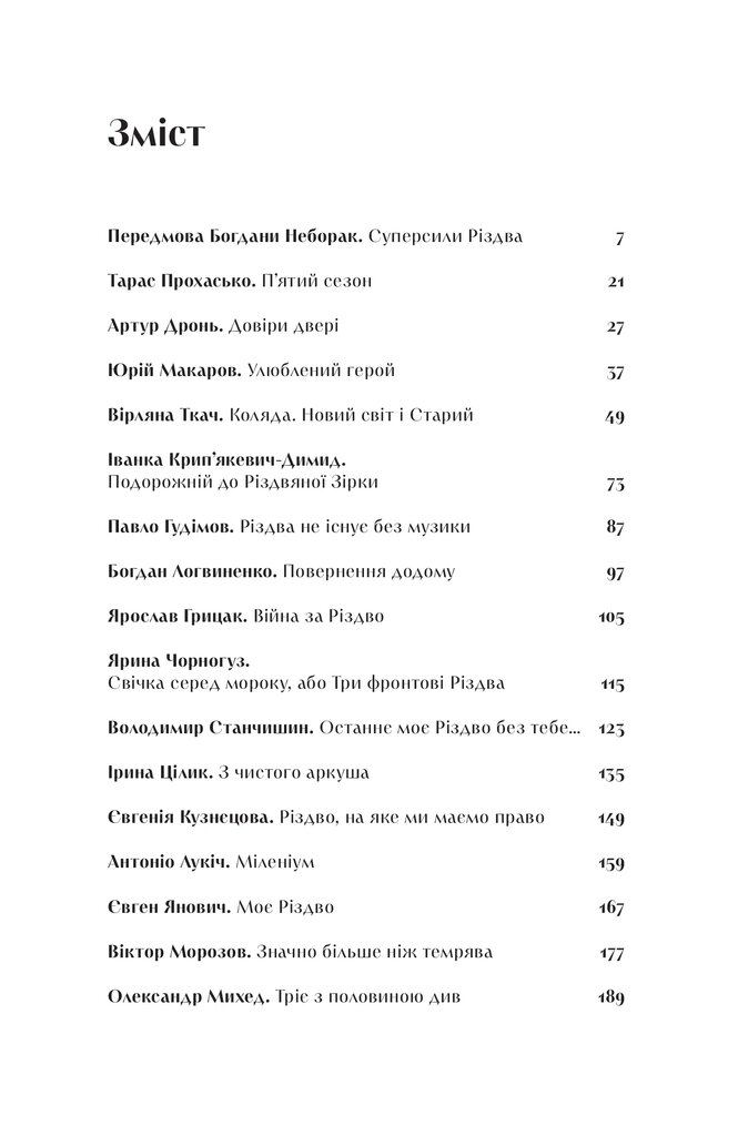 Ця книга фіксує, як відзначають Різдво в різних куточках України. Розповідає, чому ми не перестаємо вірити в найбільше диво саме в ці дні. Свою історію Різдва розповідають письменники, сценаристи, музиканти, історики, режисери, художники, психологи, актори.