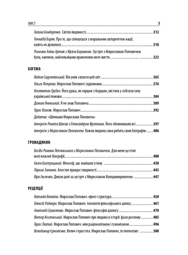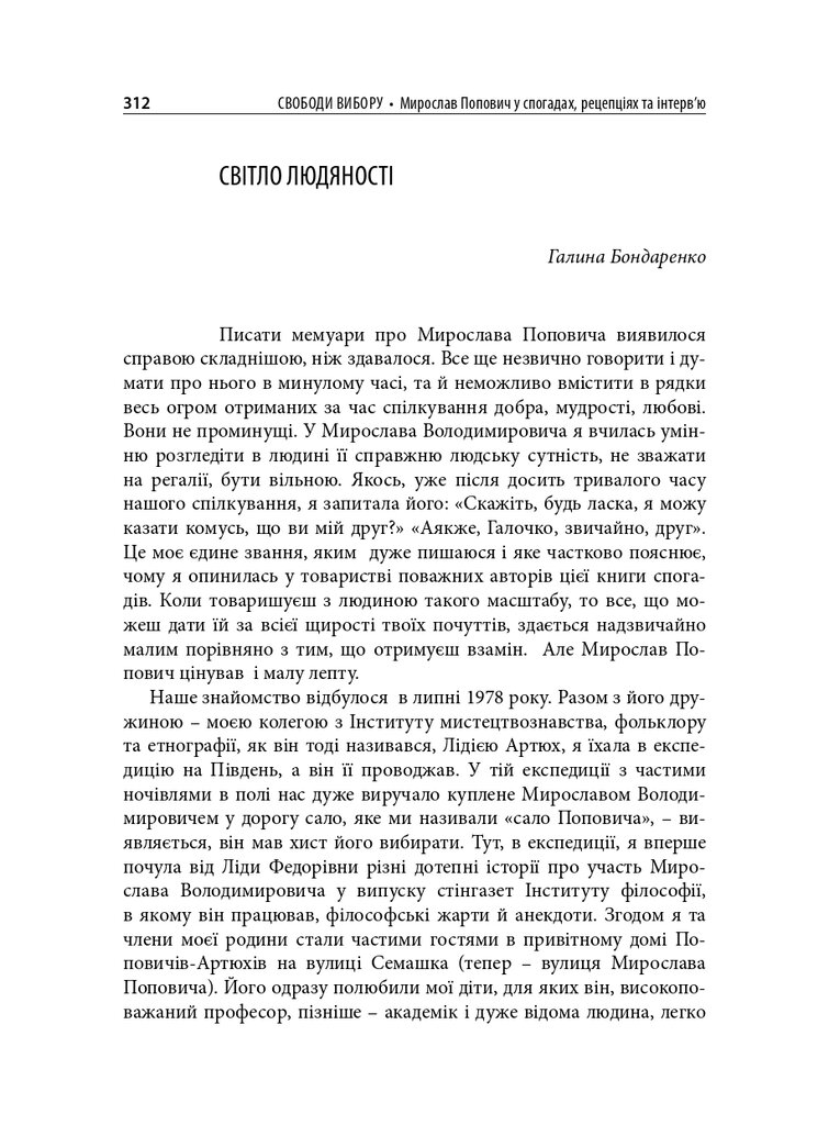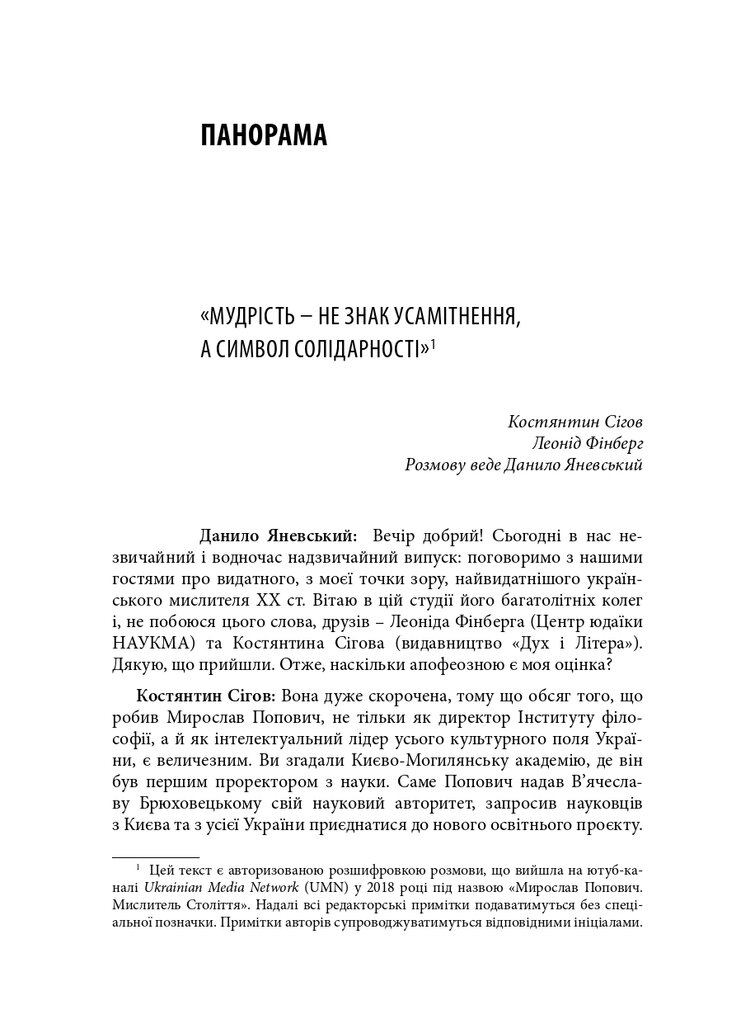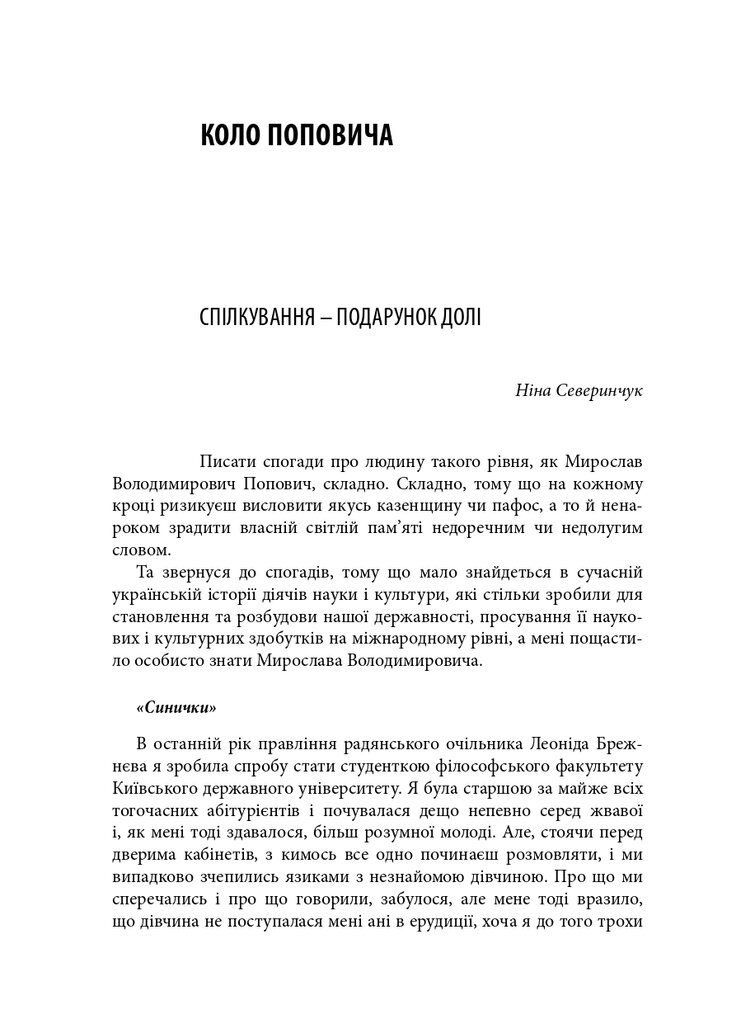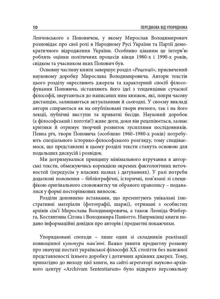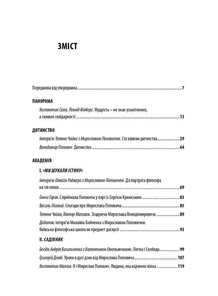 До книги увійшли різножанрові тексти – спогади, бесіди, дослідницькі статті – проукраїнського філософа і громадського діяча Мирослава Поповича (1930–2018), написані його колегами та учнями, членами родини, друзями. Серед авторів – українські й іноземні інтелектуали: Володимир Паніотто, Євген Головаха, Жорж Ніва, Тарас Возняк, Вадим Скуратівський, Володимир Єрмоленко та інші. Окрім авторських матеріалів, у книзі подано інтерв’ю з Поповичем. Деякі з них публікуються вперше.