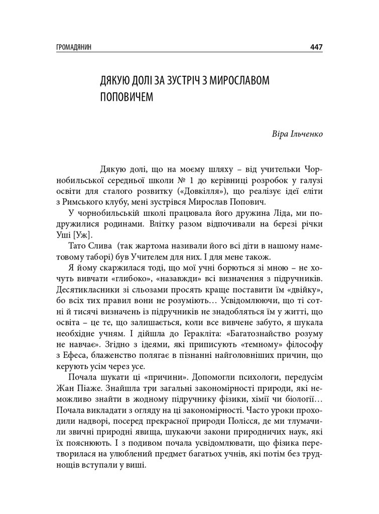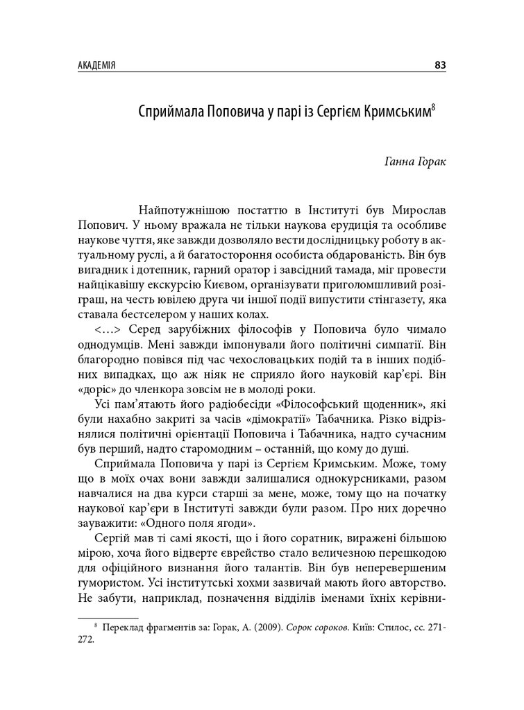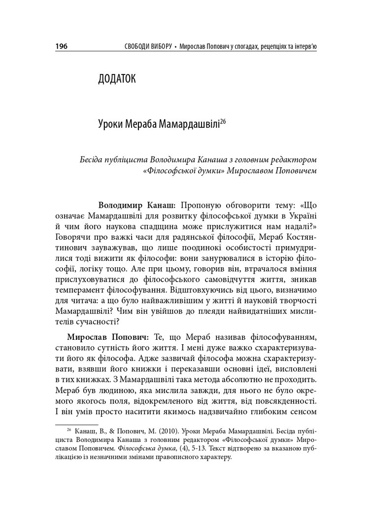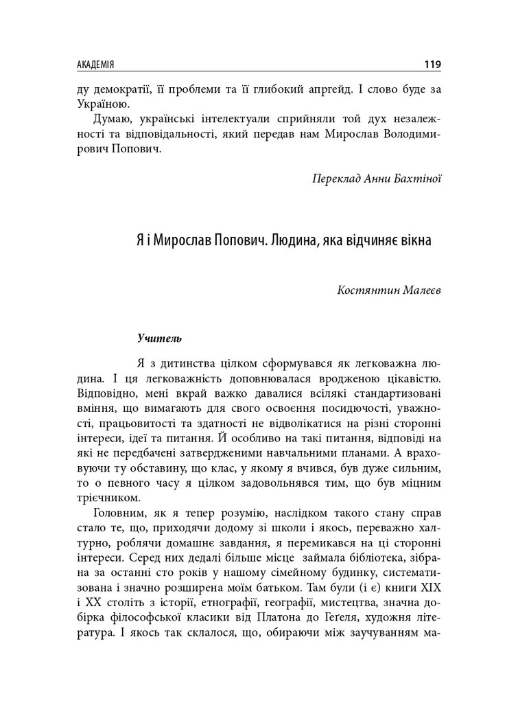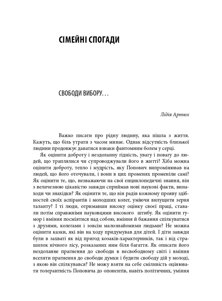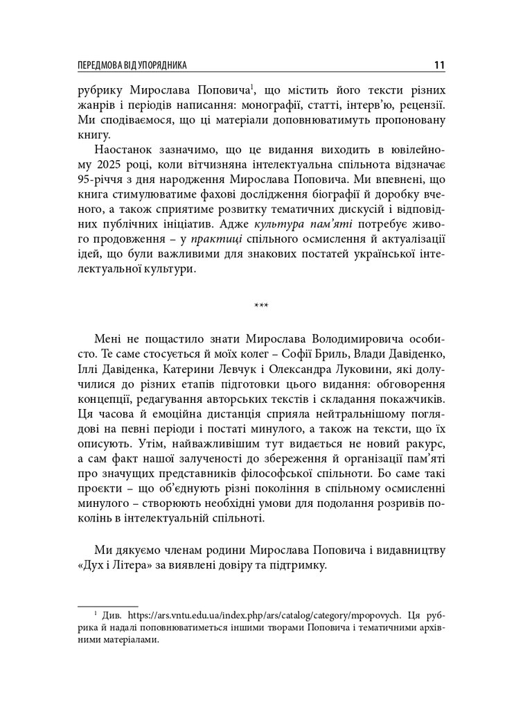 До книги увійшли різножанрові тексти – спогади, бесіди, дослідницькі статті – проукраїнського філософа і громадського діяча Мирослава Поповича (1930–2018), написані його колегами та учнями, членами родини, друзями. Серед авторів – українські й іноземні інтелектуали: Володимир Паніотто, Євген Головаха, Жорж Ніва, Тарас Возняк, Вадим Скуратівський, Володимир Єрмоленко та інші. Окрім авторських матеріалів, у книзі подано інтерв’ю з Поповичем. Деякі з них публікуються вперше.