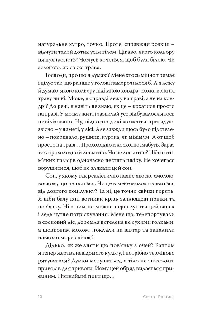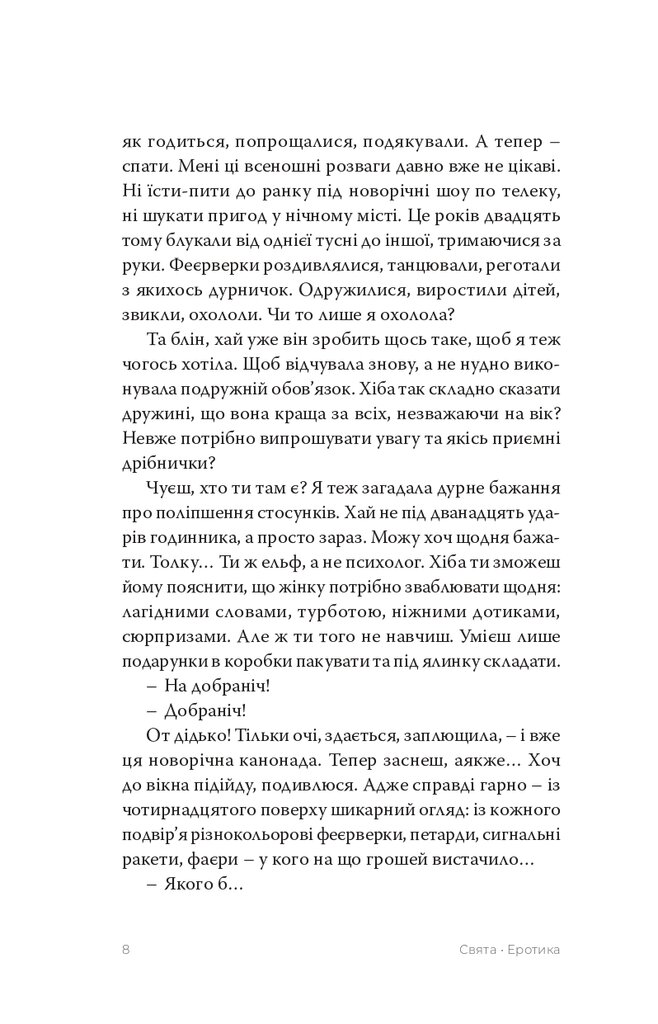 Сім свят і дев’ять еротичних історій від дев’яти сучасних українських письменниць. Герої оповідань цієї збірки фантазують про пристрасть і ніжність, шукають себе, відновлюються після травм, експериментують і роблять непростий вибір. Якщо читати історії послідовно, вони складають коло року: від новорічних чарівників через купальських русалок до різдвяних легенд. На свята ми нерідко загадуємо бажання, але що принесе героям реалізація їхніх сексуальних фантазій?